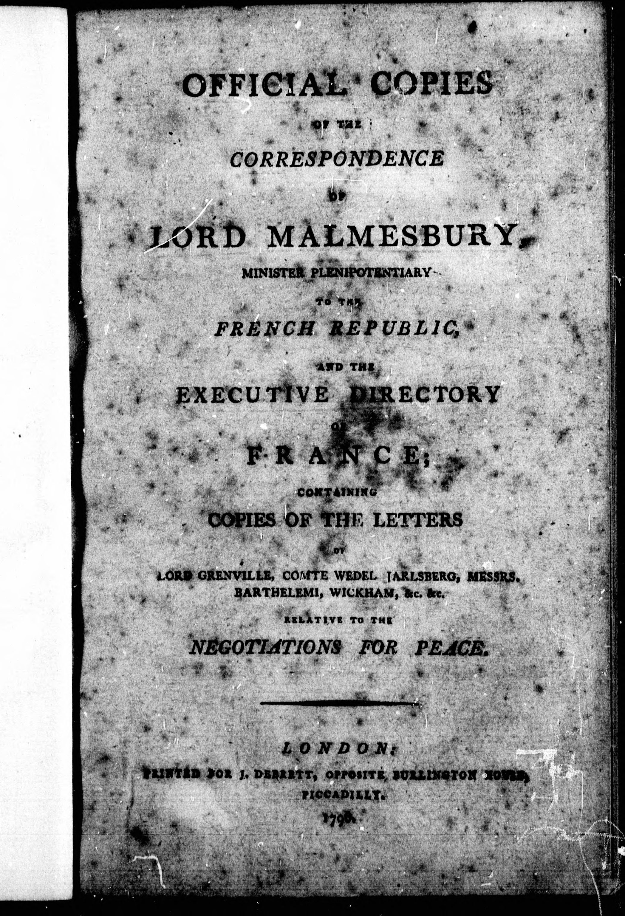 - Official copies of the correspondence of Lord Malmesbury, minister plenipotentiary to the French republic, and the executive directory of France : containing copies of the letters of Lord Grenville, Comte Wedel Jerlsberg, Messrs. Barthelemi, Wickham, &c. &c. relative to the negociations for peace.