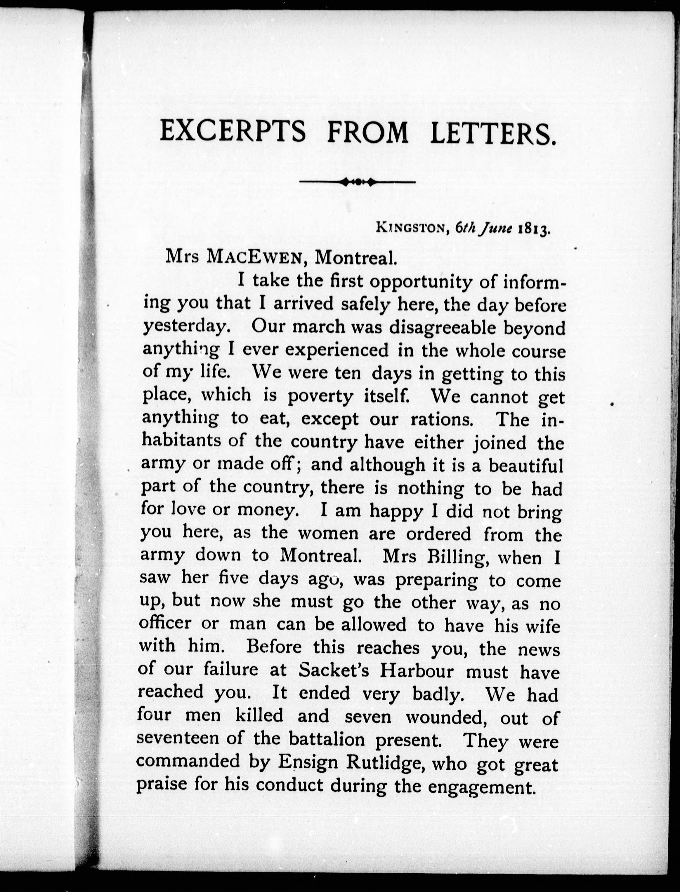 - Excerpts from letters from Lieut. and Adjutant William MacEwen, 1st Battalion Royal Scots to his wife : Canada, 1813-14.