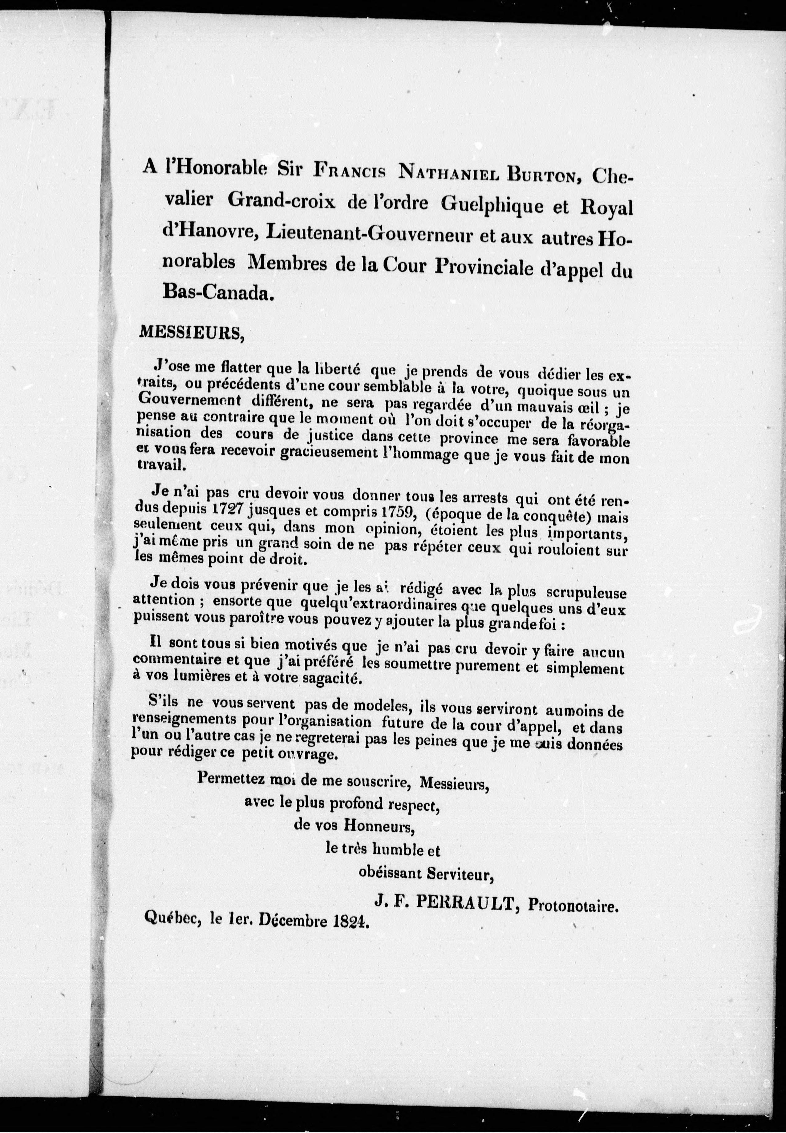 - Extraits ou précédents des arrests tirés des registres du Conseil supérieur de Québec et dédiés à Son Honneur Sir Francis Nathaniel Burton, lieutenant-gouverneur, et aux autres Honorables membres de la Cour d'appel de la province du Bas-Canada