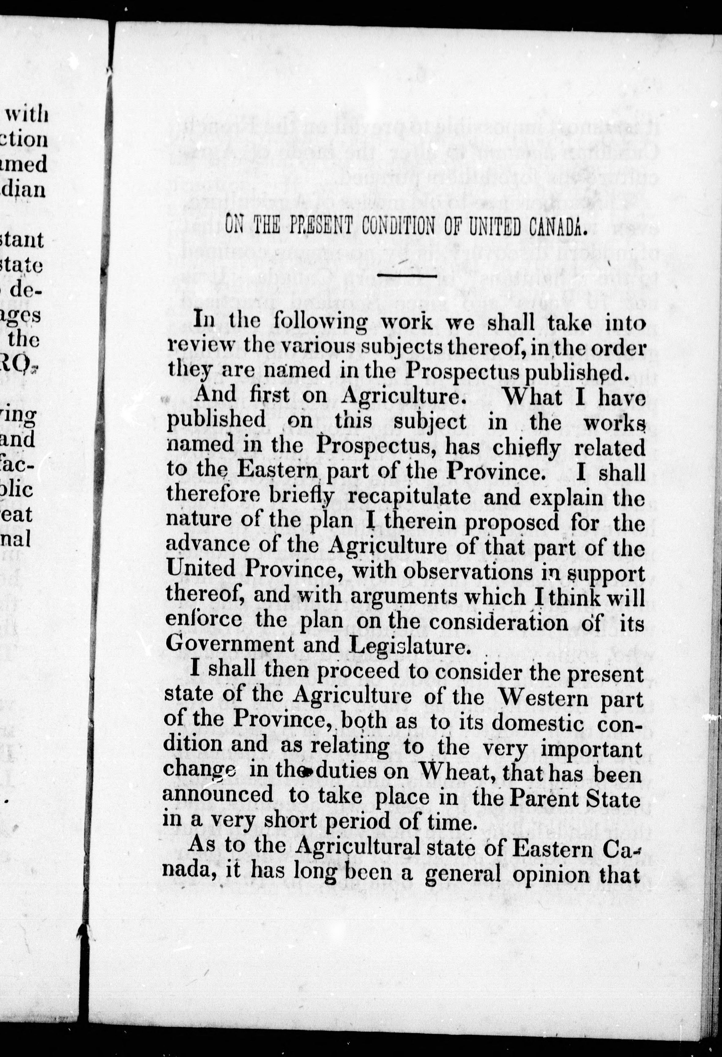 - On the present condition of United Canada, as regards her agriculture, trade, & commerce : with plans for advancing the same, and for promoting the health, wealth, and prosperity of her inhabitants : with reflections on the present state of the Protestant religion; with a view to harmonize its various sects and ultimately to bring them into one powerful united body : also a dissertation on the national debt of Great Britain, with a plan for its gradual payment