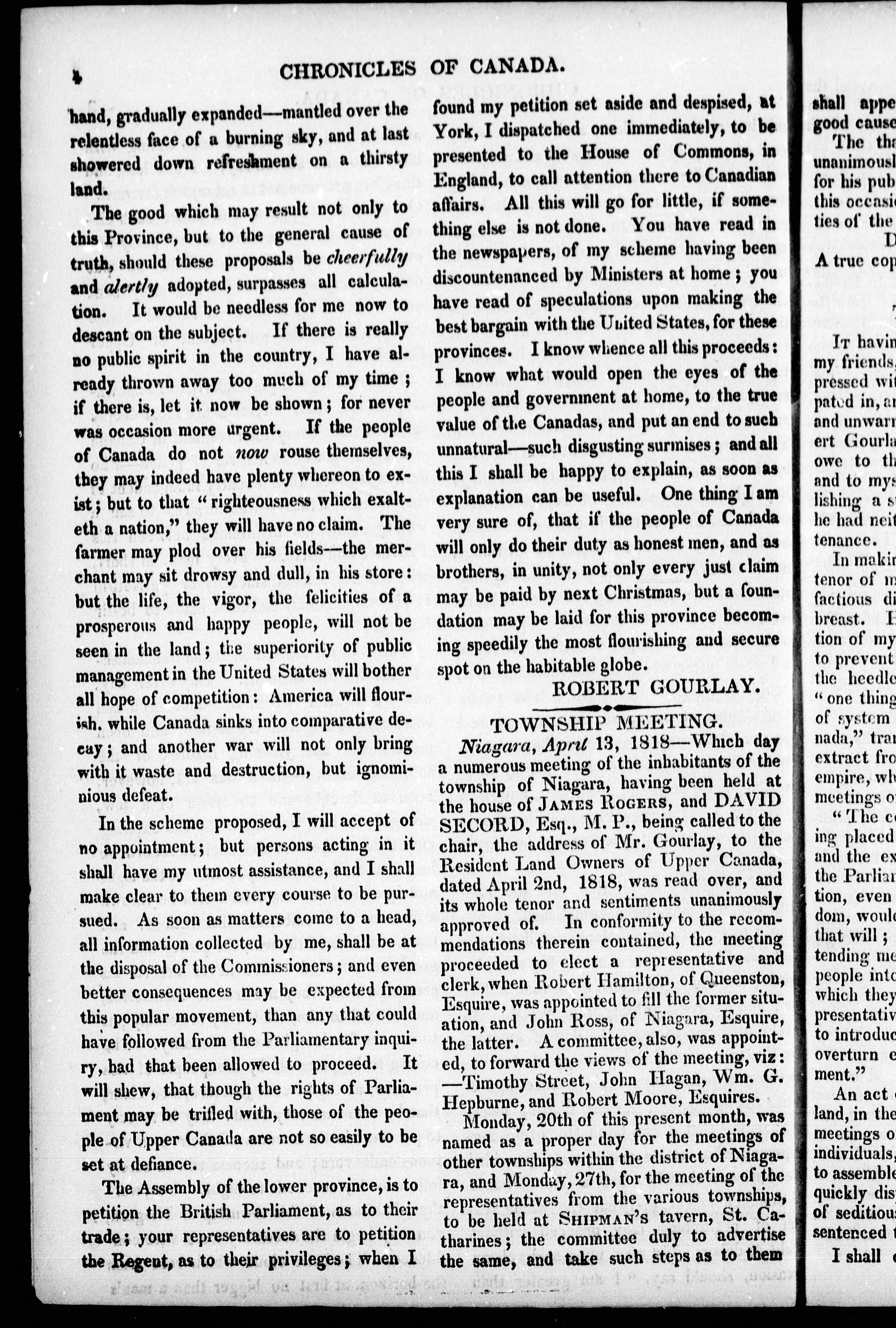Chronicles of Canada : being a record of Robert Gourlay, Esquire, now Robert Fleming Gourlay : no. 1, concerning the convention and gagging law, 1818 : Mr. Gourlay's arrest and trial, & c., & c., &c.