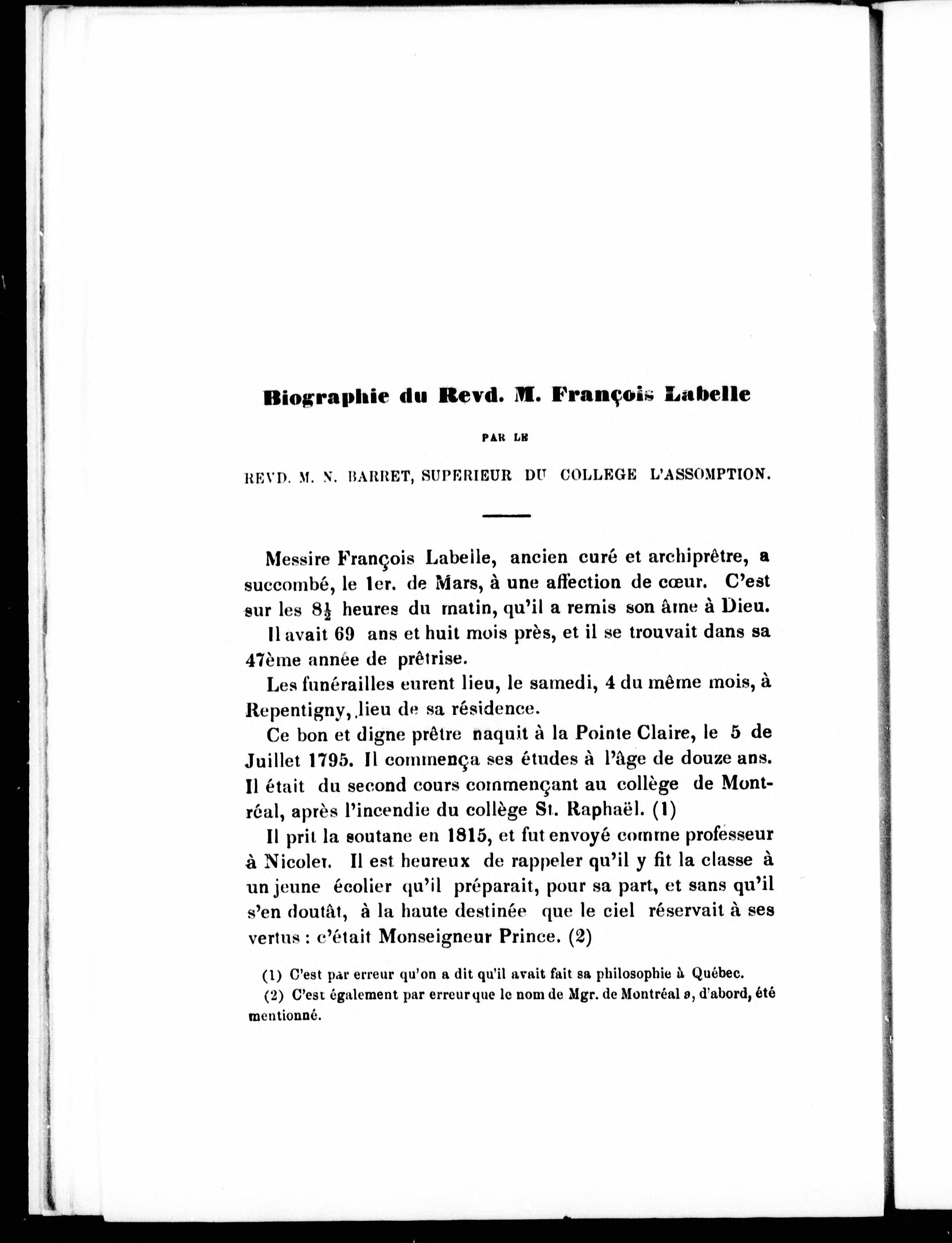 - Biographie et oraison funèbre du revd. M.F. Labelle : et autres documents relatifs à sa mémoire, ainsi qu'à la visite de Philippe Aubert de Gaspé, Ecr., au Collège l'Assomption : suivis d'une lettre de Mgr. de Montréal et d'un bref du souverain pontife.
