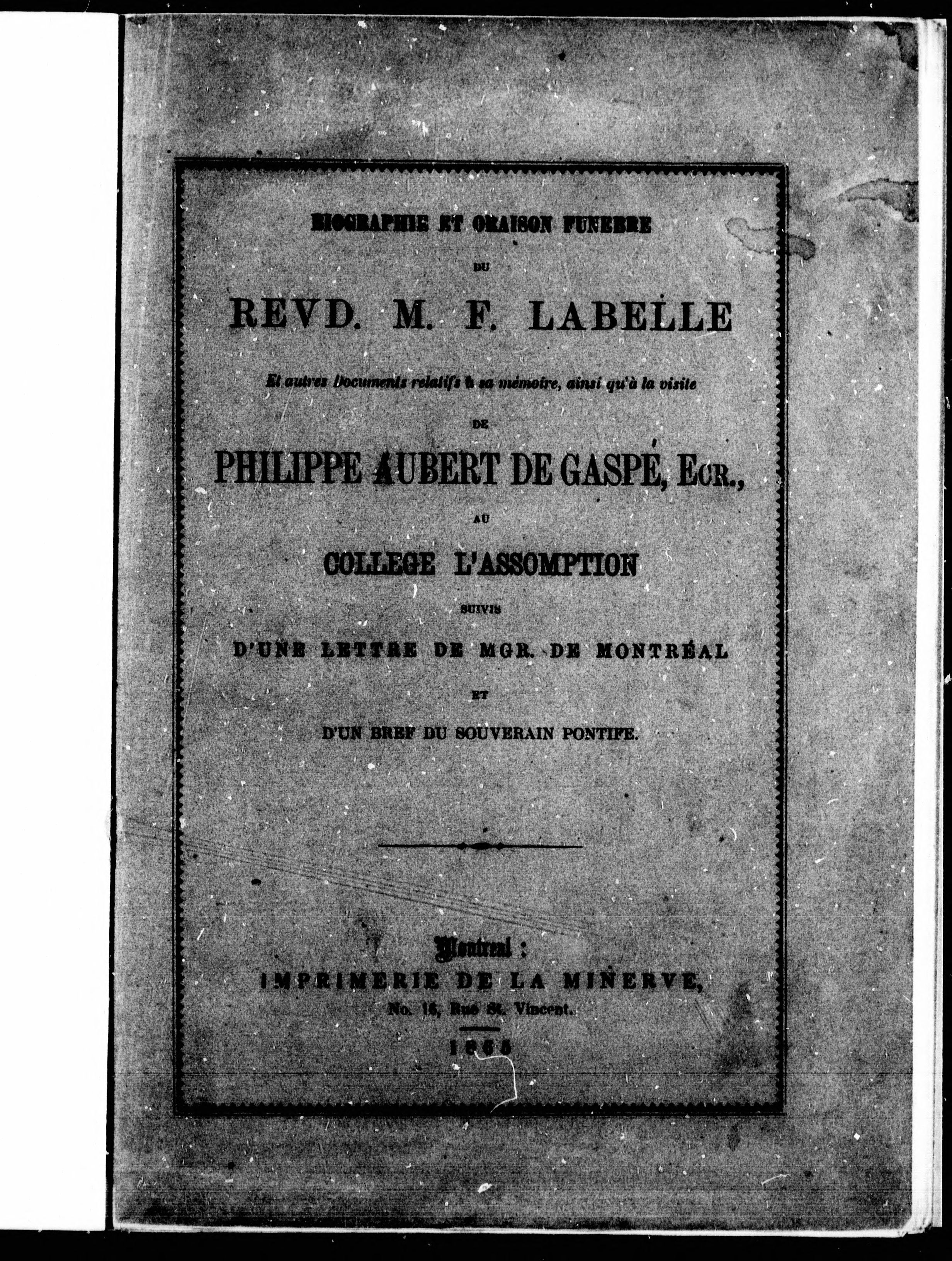 - Biographie et oraison funèbre du revd. M.F. Labelle : et autres documents relatifs à sa mémoire, ainsi qu'à la visite de Philippe Aubert de Gaspé, Ecr., au Collège l'Assomption : suivis d'une lettre de Mgr. de Montréal et d'un bref du souverain pontife.