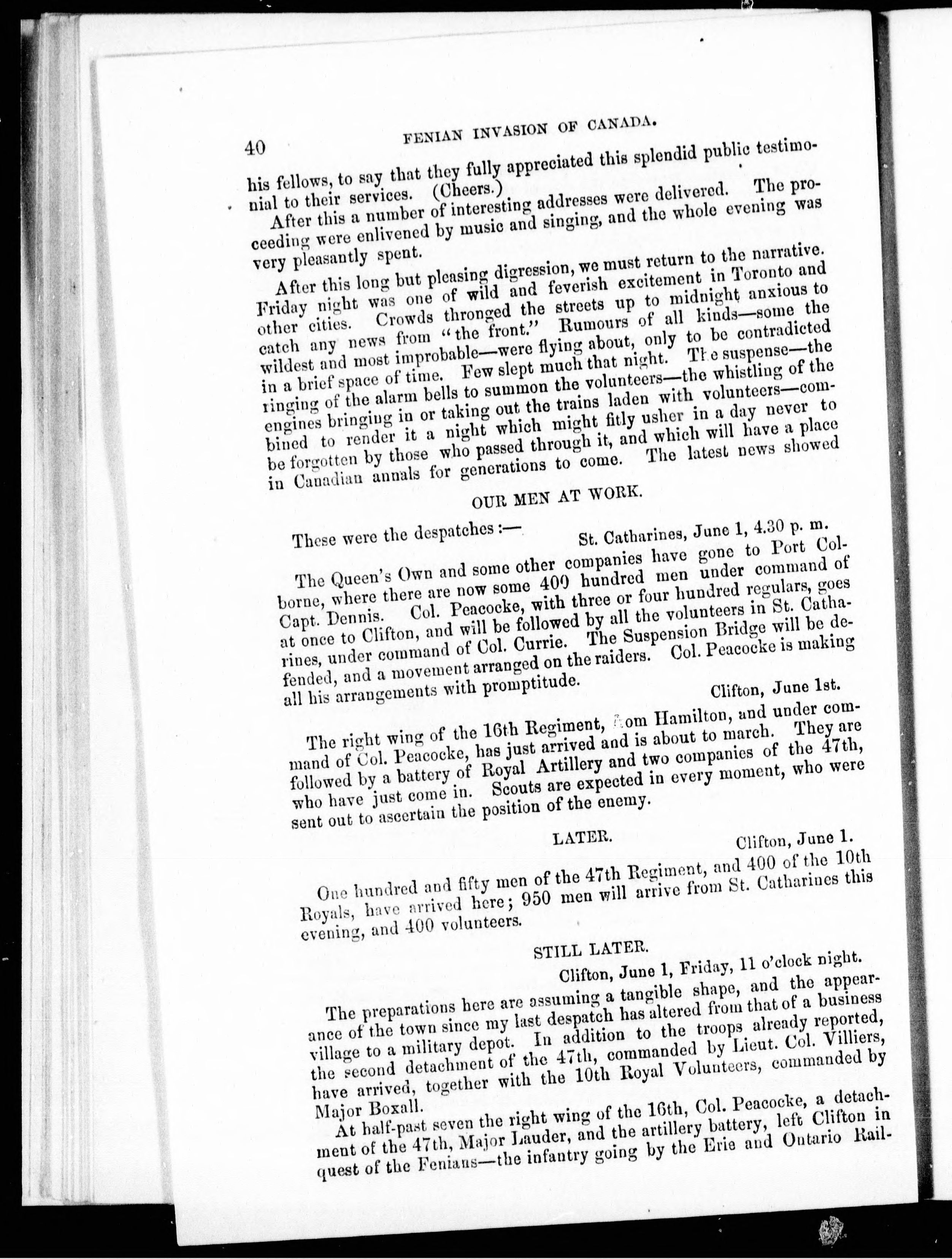 - The Fenian raid at Fort Erie, June the first and second, 1866 : with a map of the Niagara Peninsula, shewing the route of the troops, and a plan of the Lime Ridge battle ground.