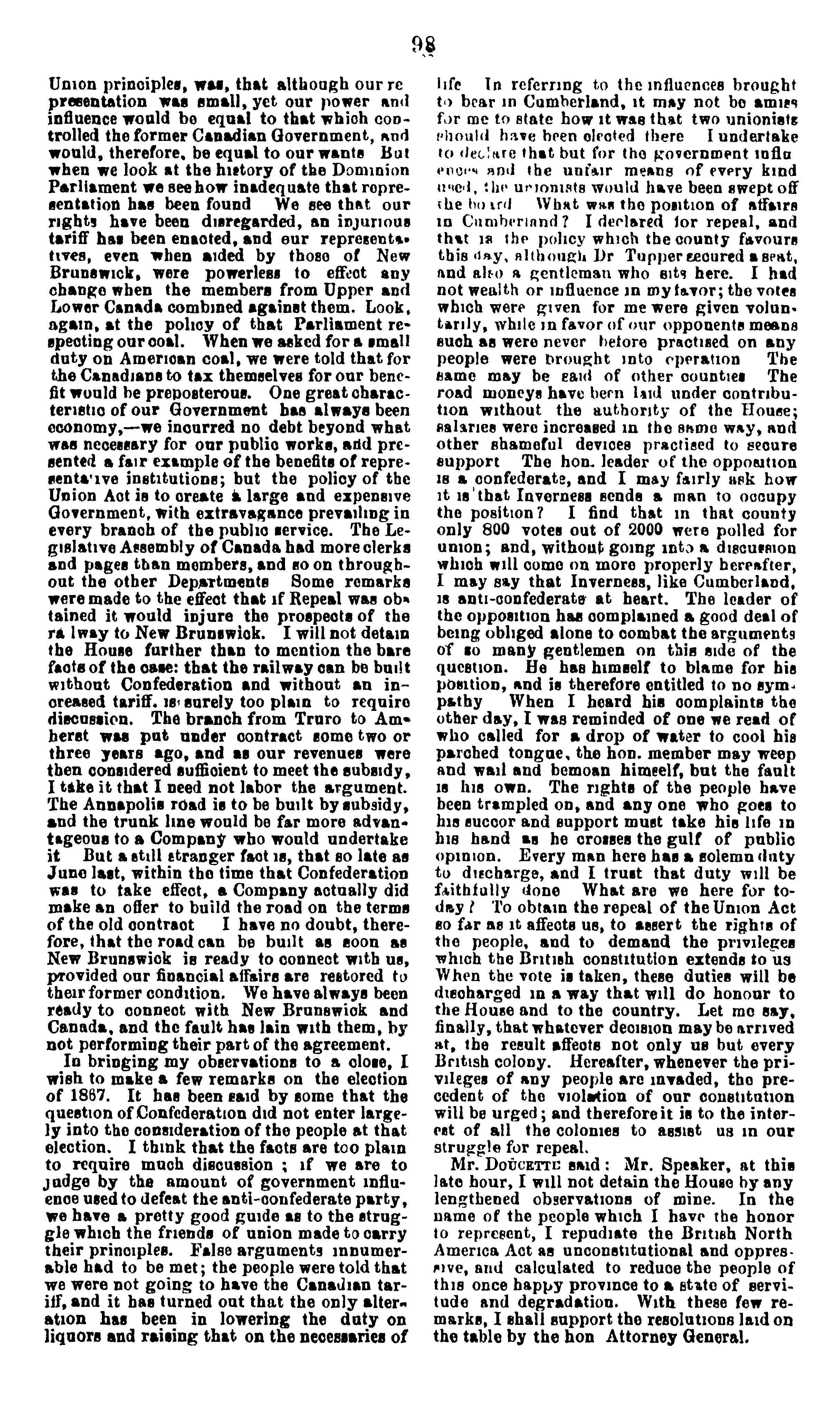 Debate on resolutions relative to repeal of the "British North America Act" in the House of Assembly of Nova Scotia; session 1868 .