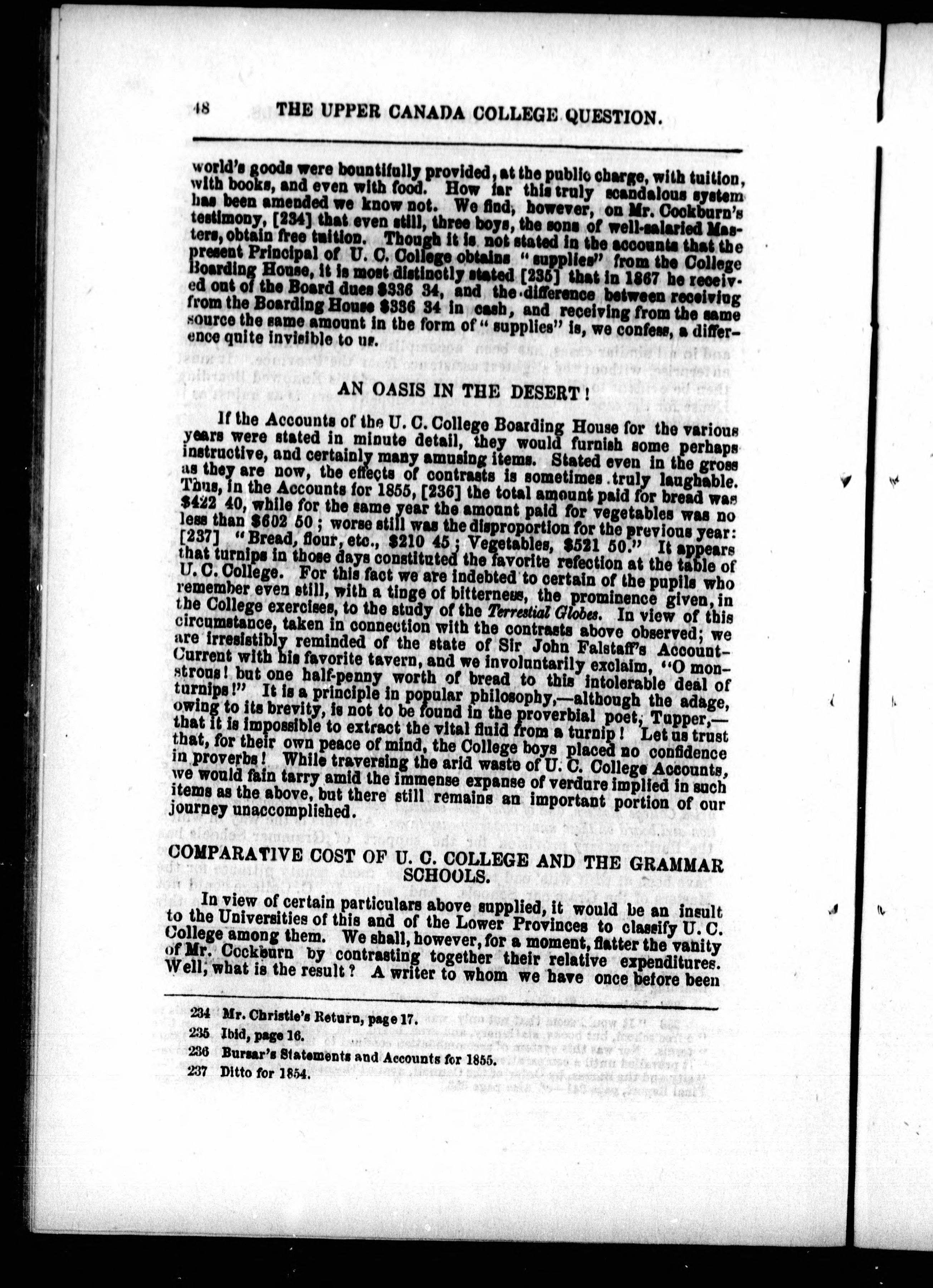 The U.C. College question : an examination, in what is believed to be intelligible language, of three points: 1. how U.C. College came to be established in defiance of the legislature; 2. how U. C. College has contrived to absorb more than one-half of the endowment of the provincial university; 3. why U.C. College has been so long permitted to remain a charge on the grammar school endowment : with full references to original documents