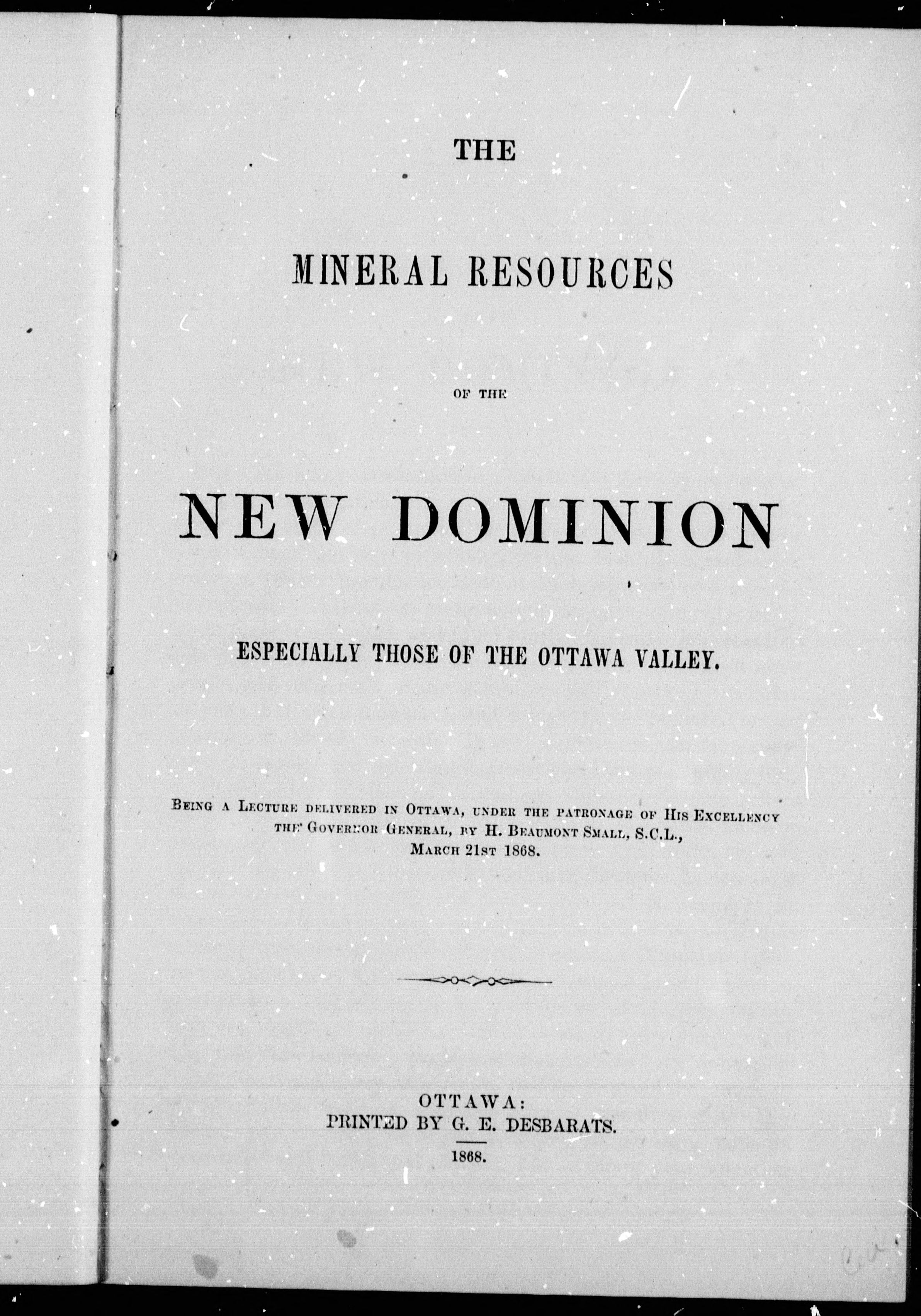 - The mineral resources of the new Dominion : especially those of the Ottawa Valley : being a lecture delivered in Ottawa under the patronage of His Excellency the Governor General, March 21st, 1868