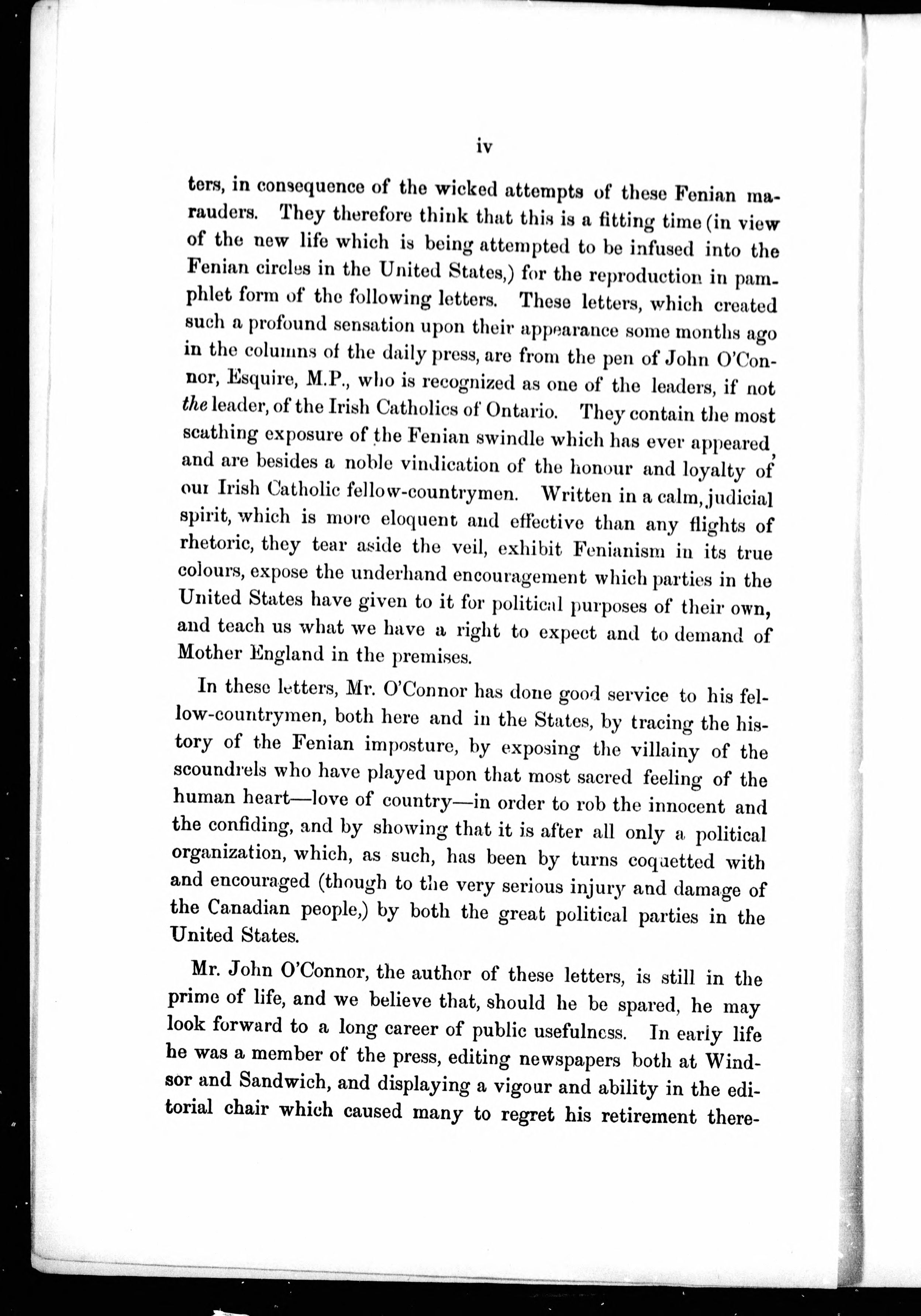 - Letters of John O'Connor, M.P. on Fenianism : addressed to His Excellency the Right Honourable John Young, Bart., P. C., G.C.B., G.C.MG., governor-general of Canada, etc., etc., etc.