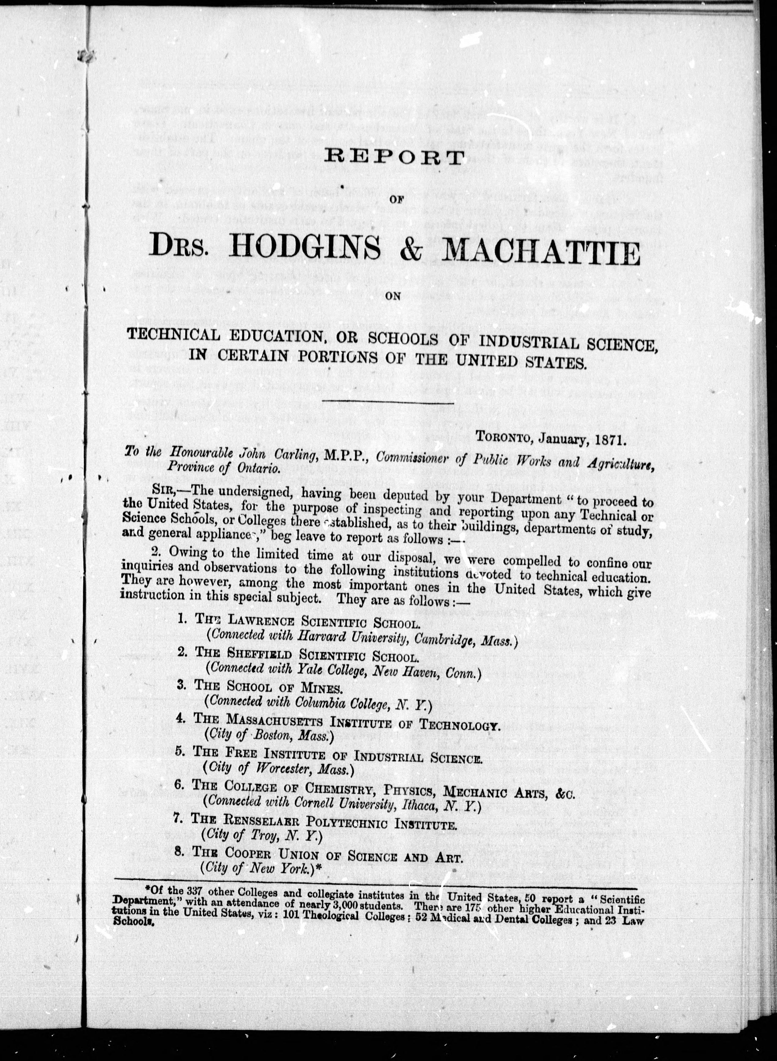 "Submitted to the Honourable John Carling, M.P.P., Commissioner of Public Works and Agriculture for the Province of Ontario, Jan., 1871."