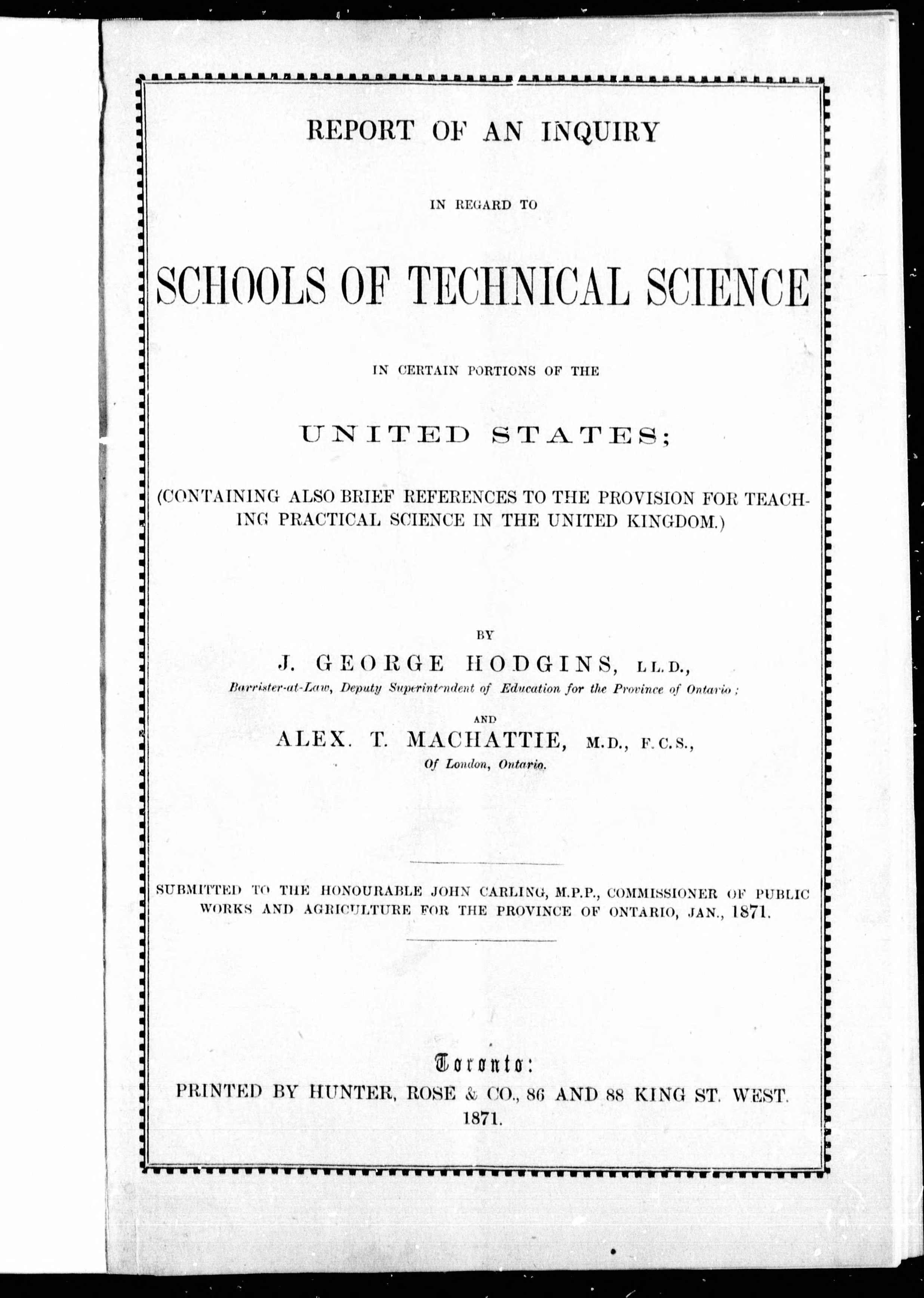 "Submitted to the Honourable John Carling, M.P.P., Commissioner of Public Works and Agriculture for the Province of Ontario, Jan., 1871."