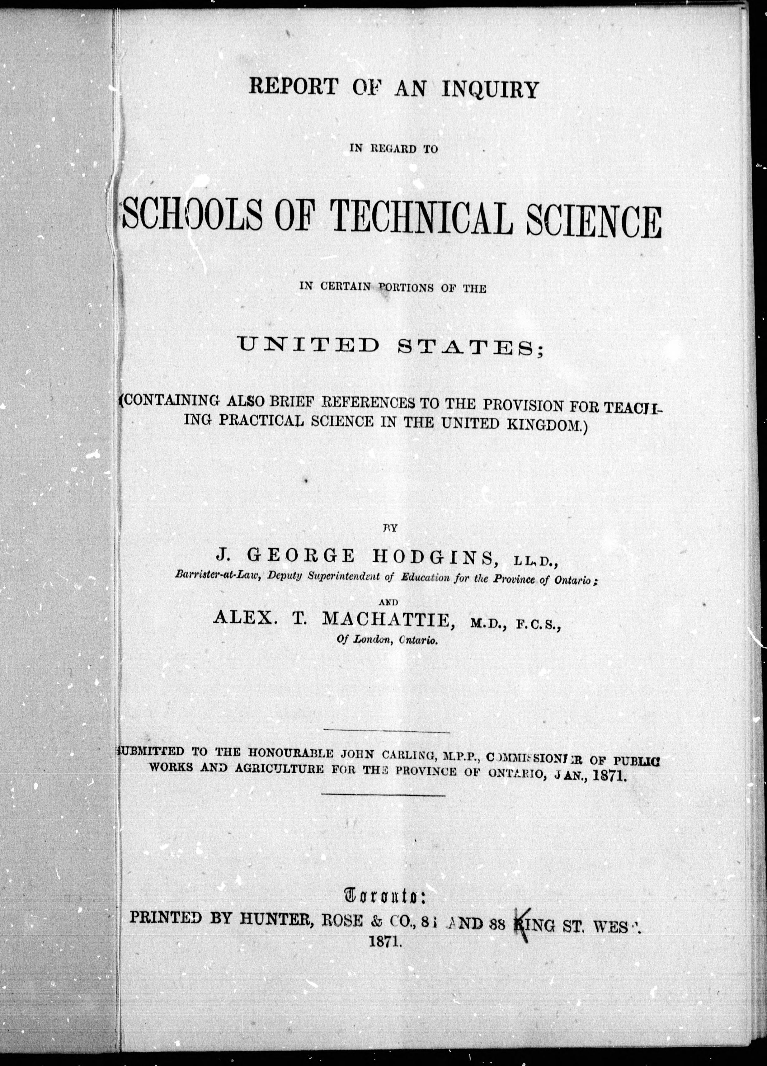 "Submitted to the Honourable John Carling, M.P.P., Commissioner of Public Works and Agriculture for the Province of Ontario, Jan., 1871."