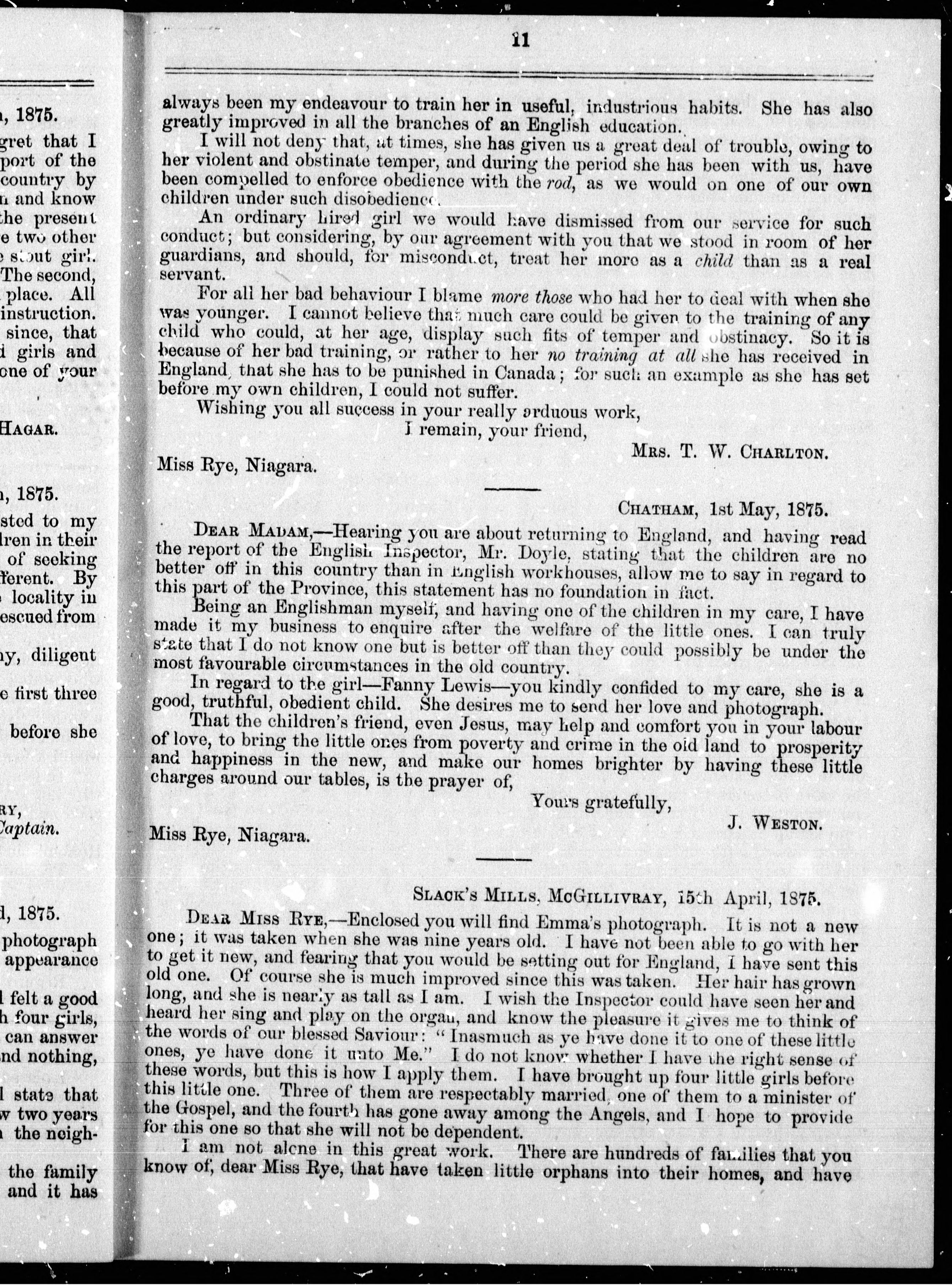 Letters from the provinces of New Brunswick, Ontario and Quebec, to Miss Maria S. Rye, of Niagara, relating to the emigration of pauper children to Canada.