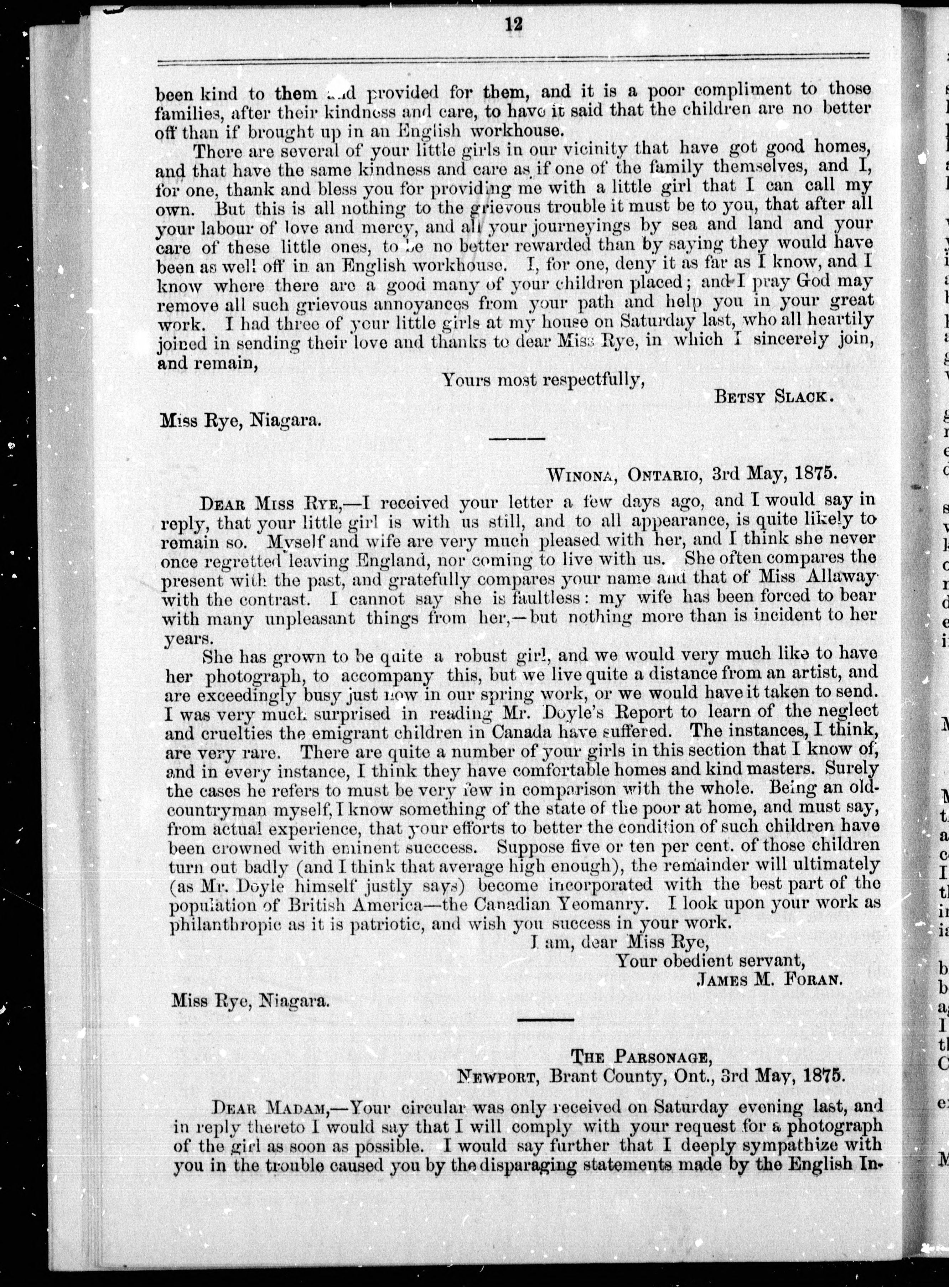 Letters from the provinces of New Brunswick, Ontario and Quebec, to Miss Maria S. Rye, of Niagara, relating to the emigration of pauper children to Canada.
