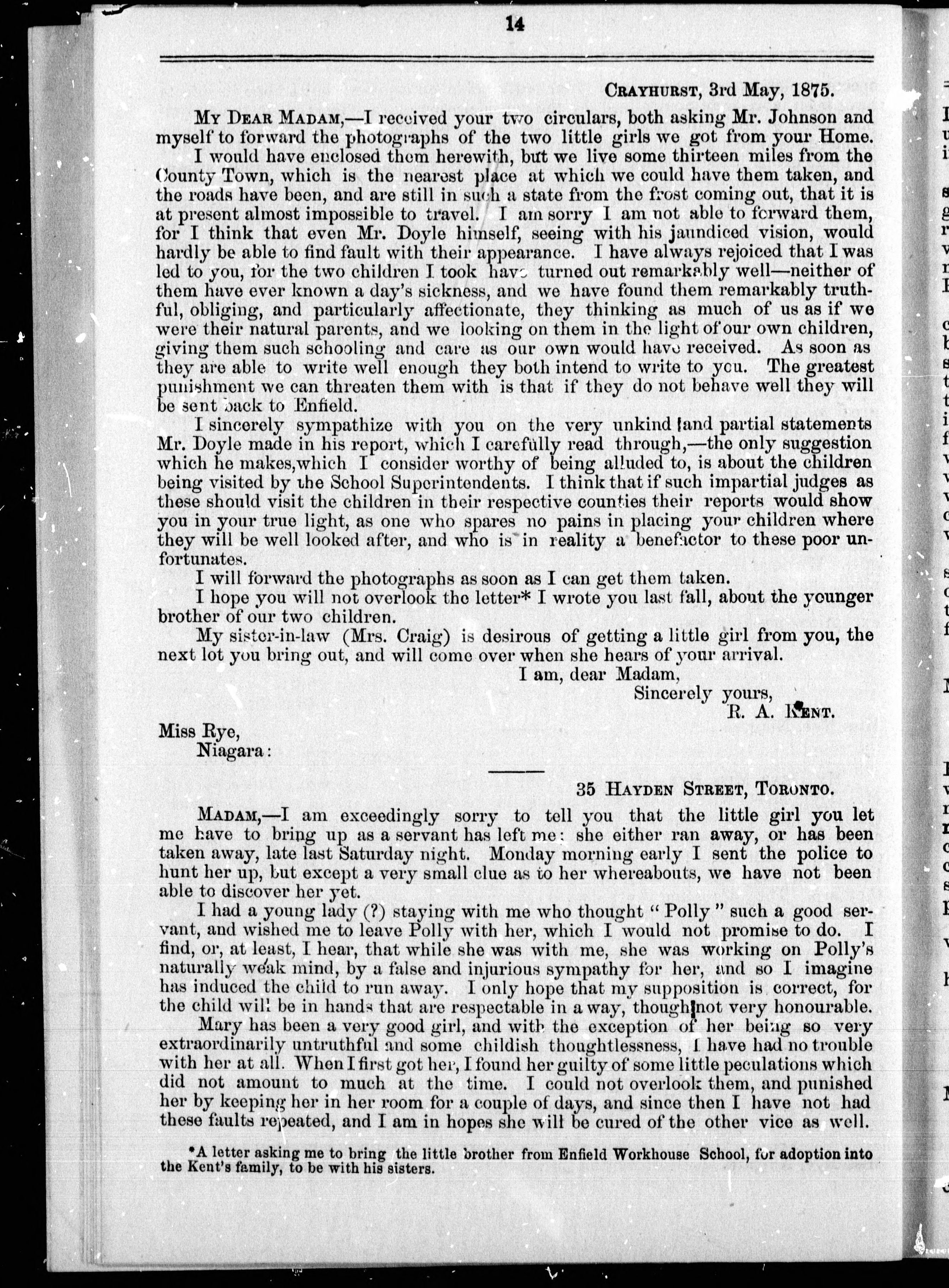 Letters from the provinces of New Brunswick, Ontario and Quebec, to Miss Maria S. Rye, of Niagara, relating to the emigration of pauper children to Canada.