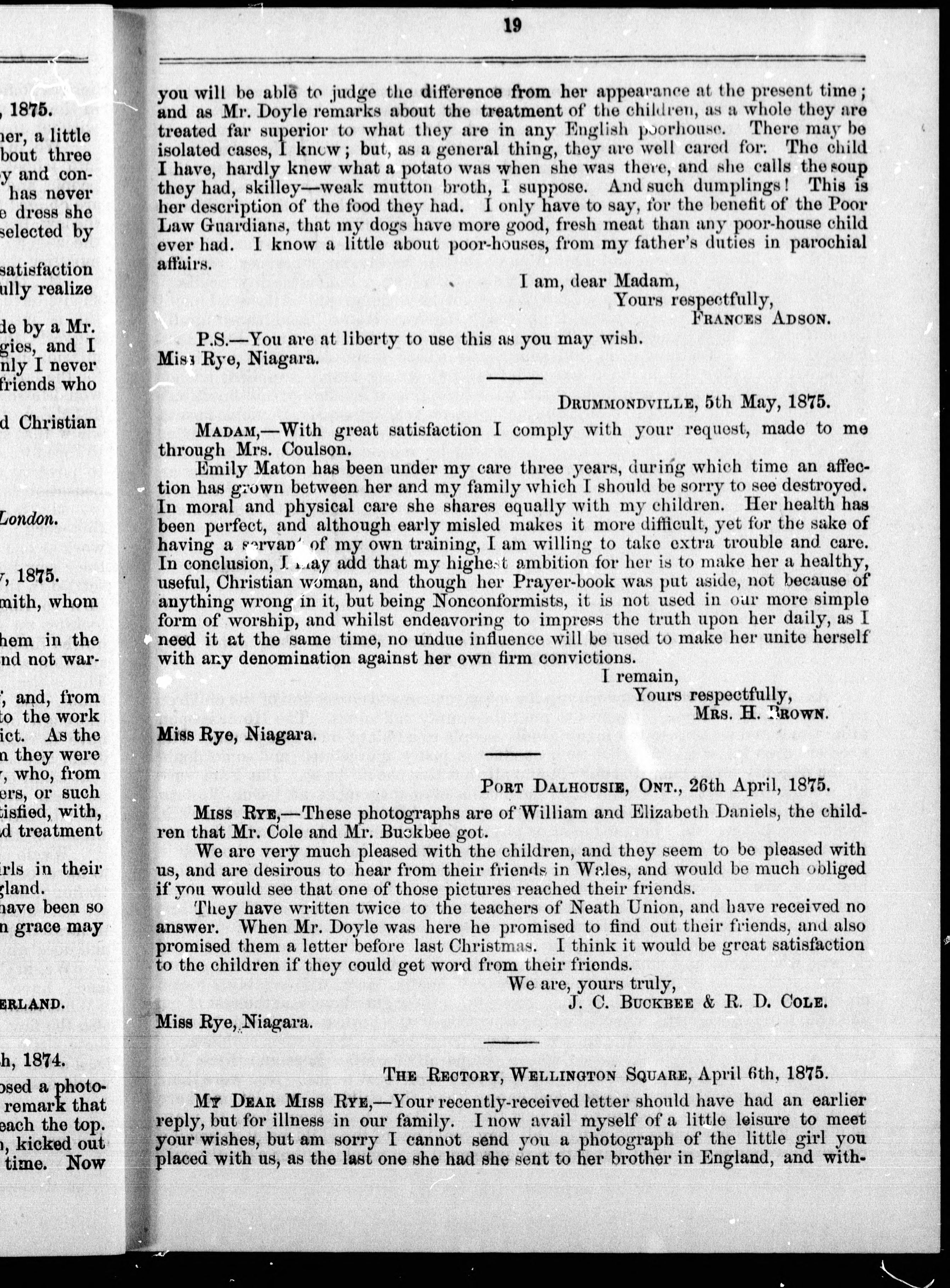 Letters from the provinces of New Brunswick, Ontario and Quebec, to Miss Maria S. Rye, of Niagara, relating to the emigration of pauper children to Canada.