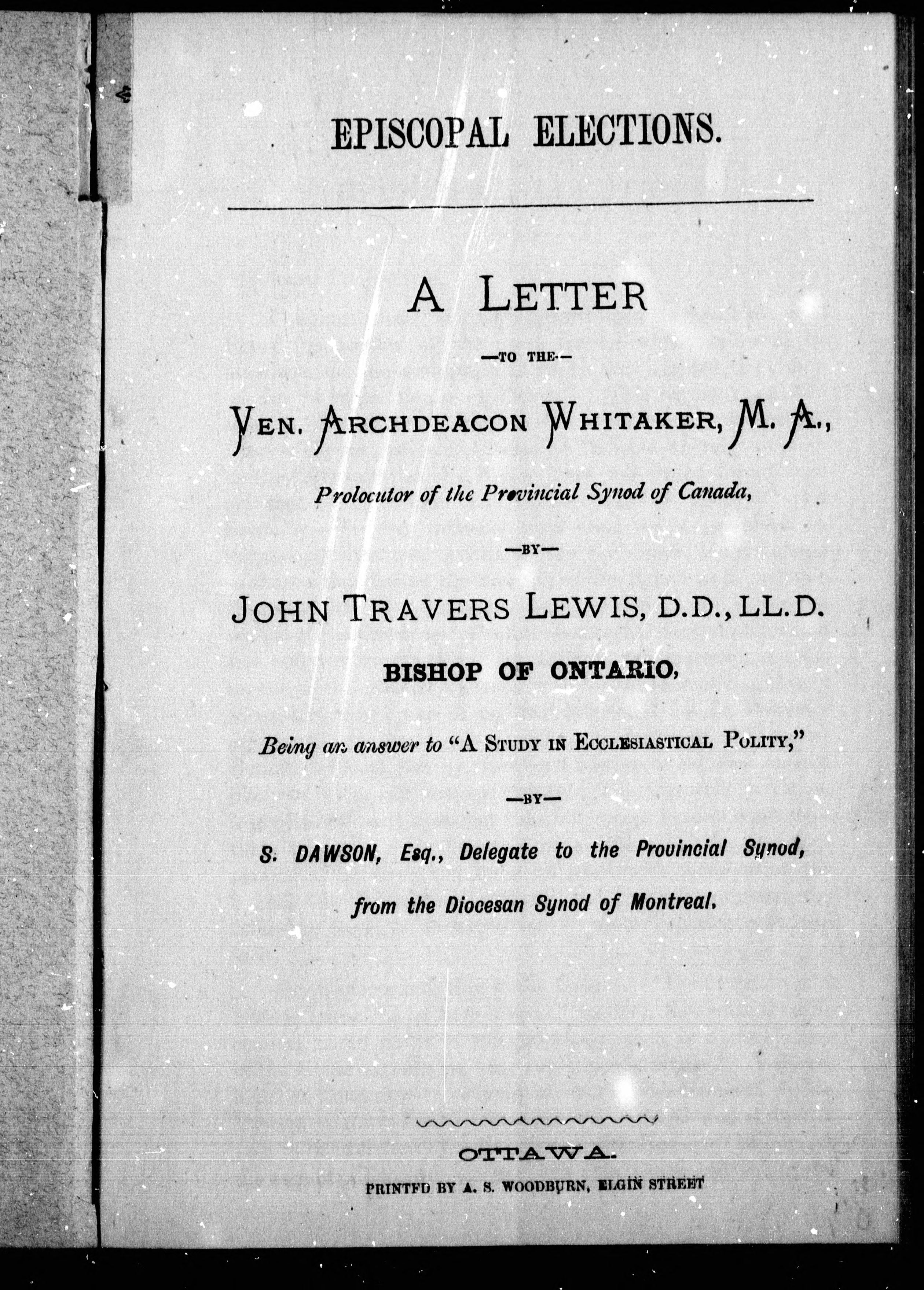Episcopal elections : a letter to the Ven. Archdeacon Whitaker, M.A., prolocutor of the Provincial Synod of Canada by John Travers Lewis, D.D., LL.D., Bishop of Ontario ; being an answer to "A study in ecclesiastical polity" by S. Dawson, Esq., delegate to the Provincial Synod, from the Diocesan Synod of Montreal.