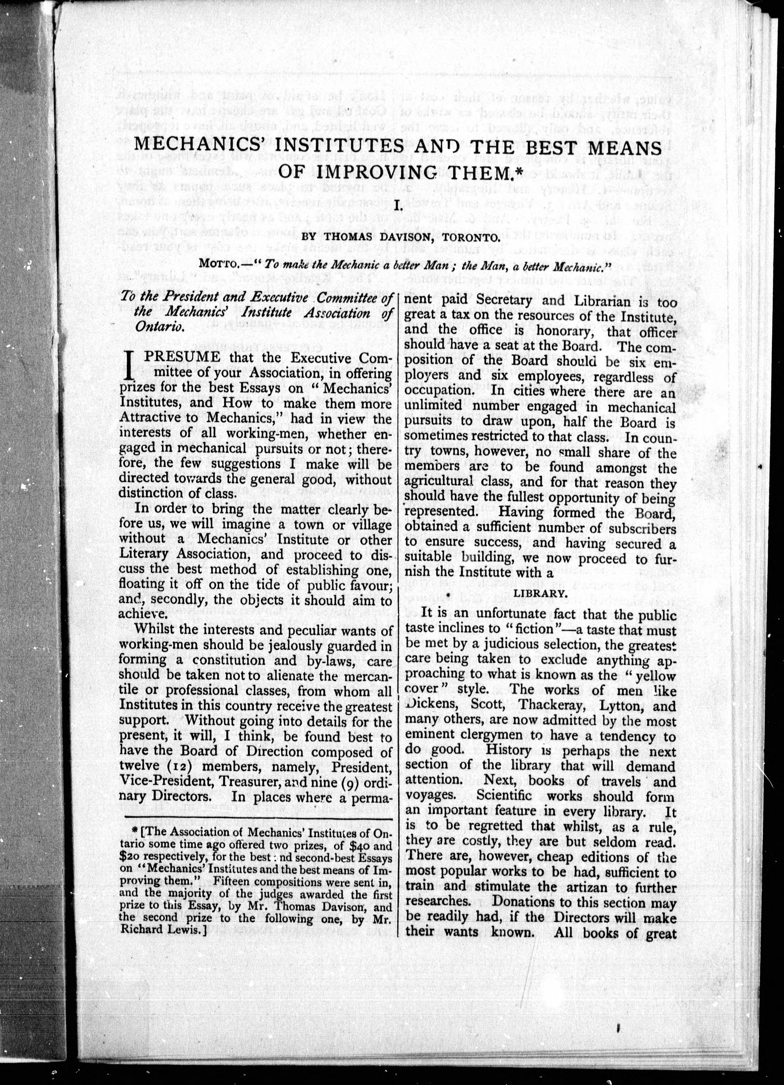 First essay by Thomas Davison; second by Richard Lewis. These were the first and second prize essays, respectively, in a competition held by the Association of Mechanics' Institutes of Ontario.