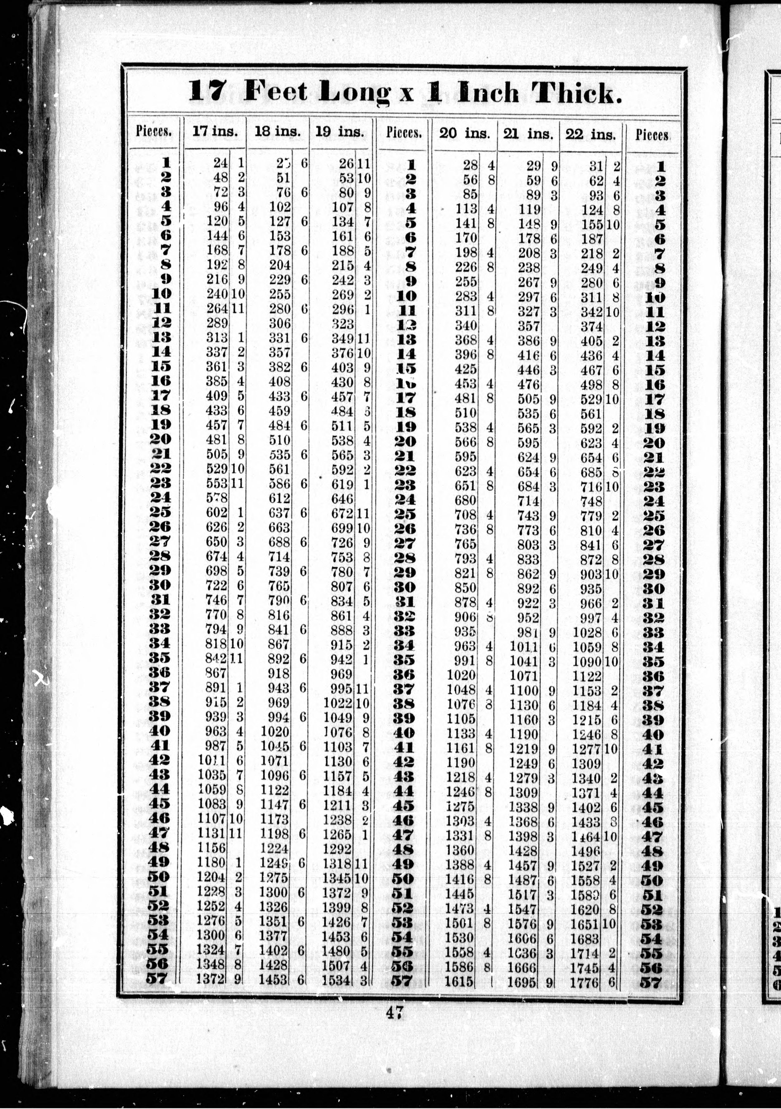 Tables for converting one inch lumber and Quebec standard into board measure.