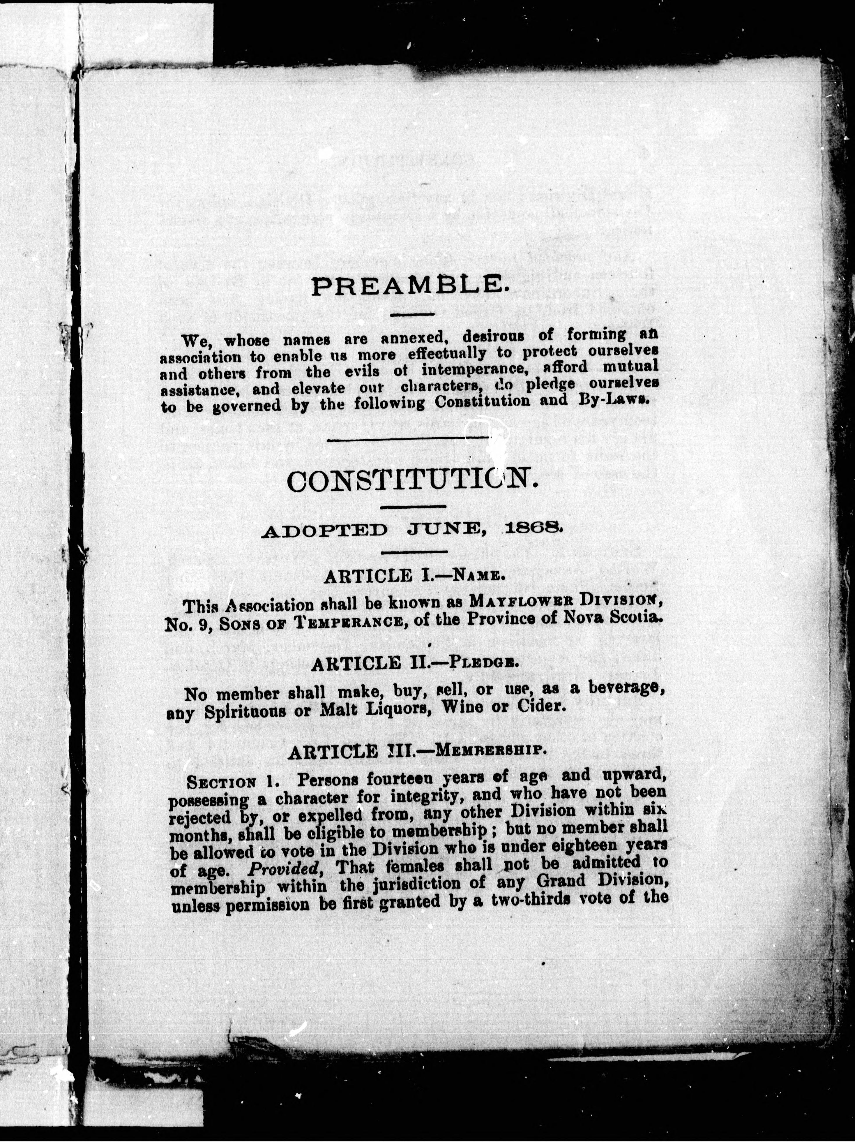 Constitution and by-laws of [M]ayflower Division, No. 9, Sons of Temperance of the province of Nova Scotia : organized at Halifax, February 9, 1848.