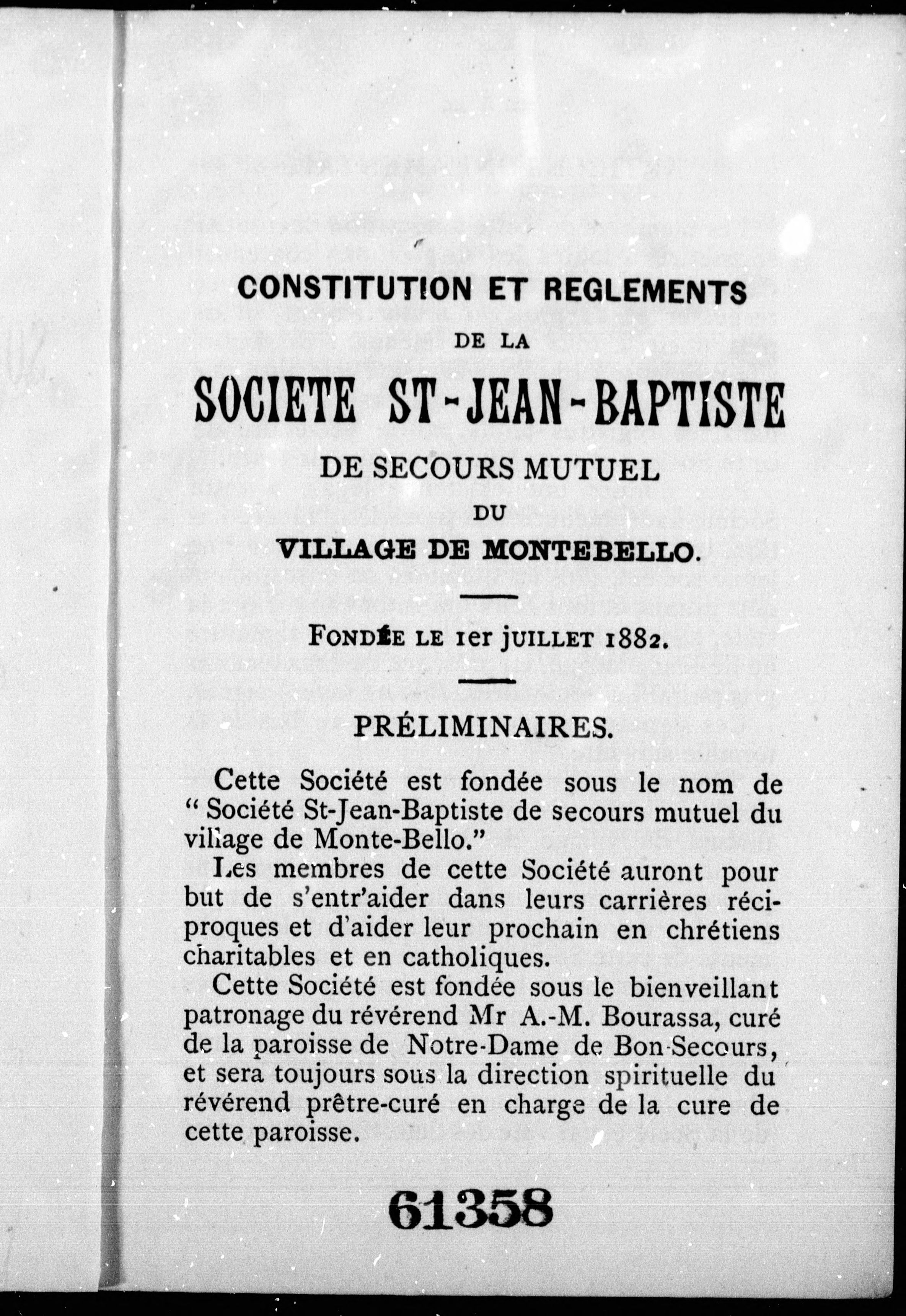 Constitution et règlements de la Société Saint-Jean-Baptiste de secours mutuel du village de Montebello :