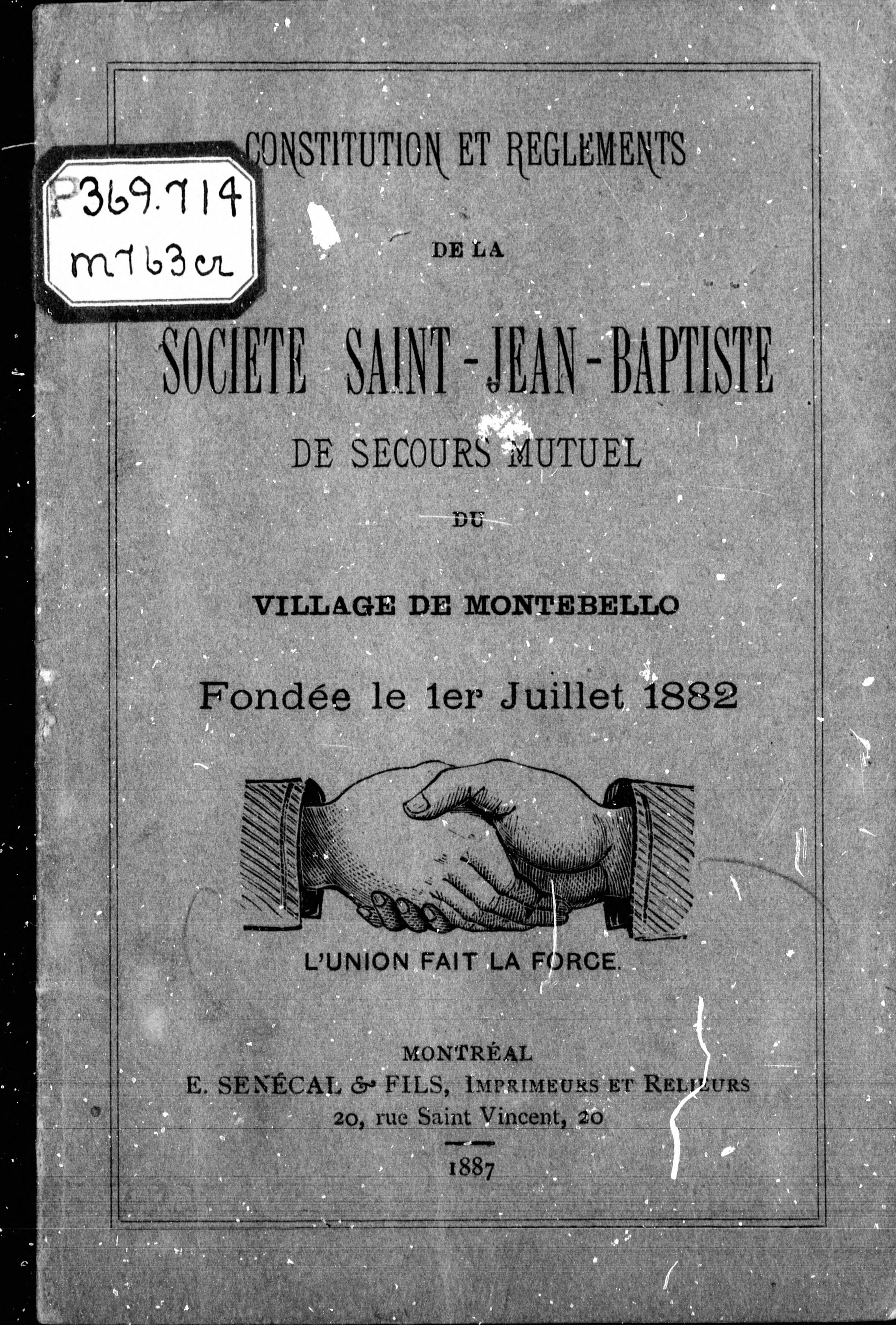 Constitution et règlements de la Société Saint-Jean-Baptiste de secours mutuel du village de Montebello : fondée le 1er juillet 1882. - Adresse bibliographique