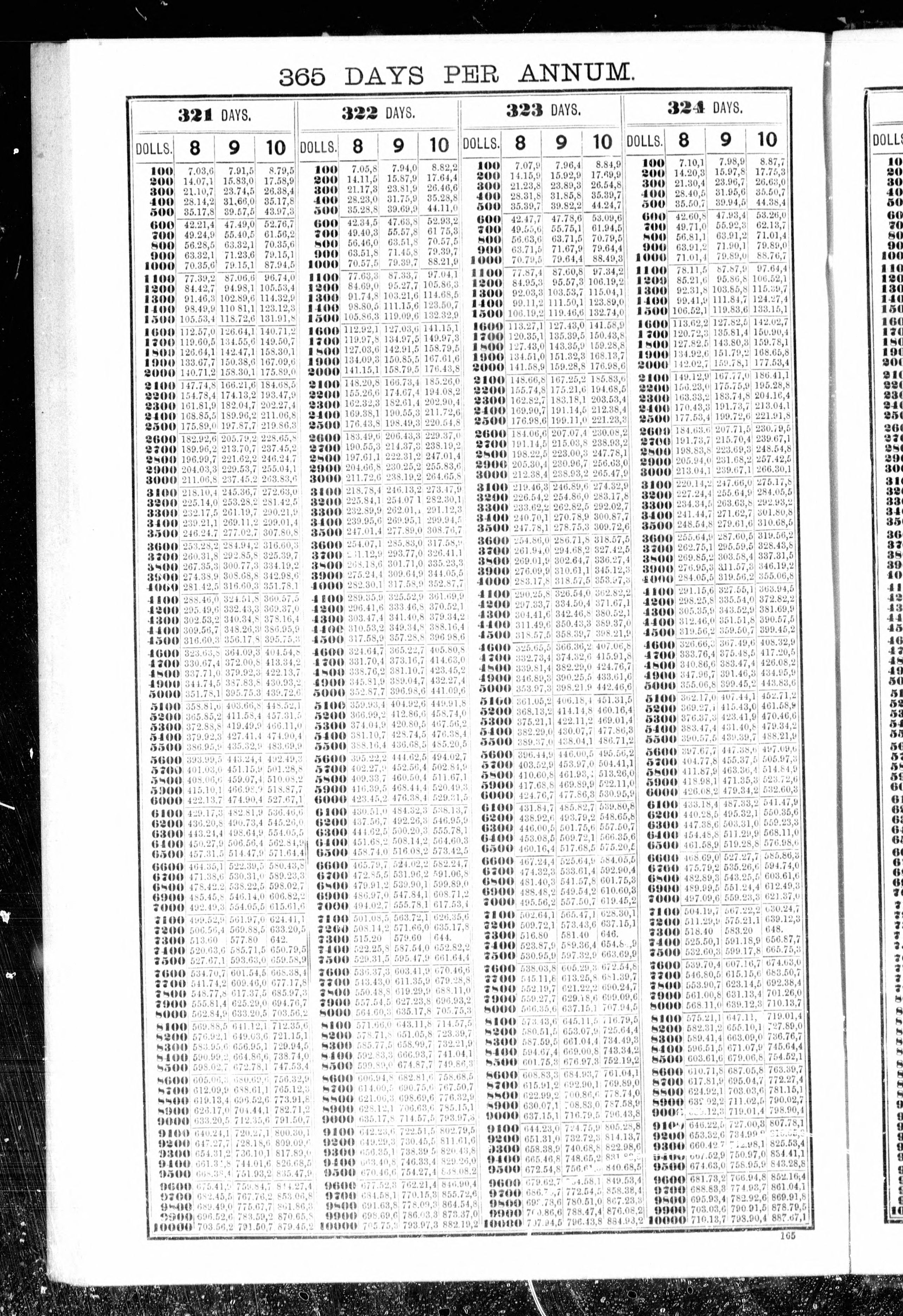 - Interest tables at eight, nine and ten per cent per annum : each rate exhibiting the interest on all sums from on dollar to one hundred thousand dollars, from one to three hundred and sixty-eight days, computed for 365 days per annum