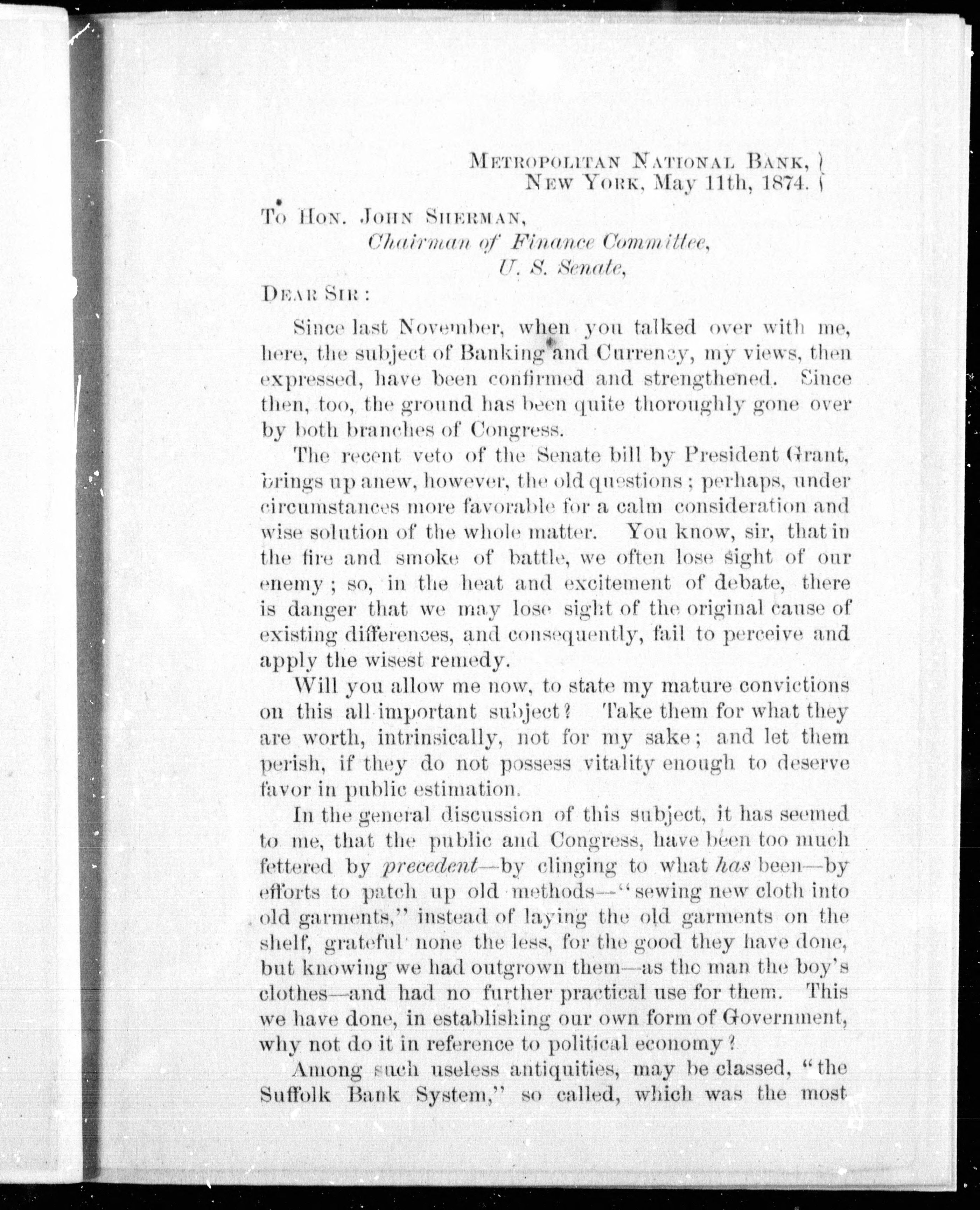 Letters to Hon. John Serman, chairman of Finance Committee, U.S. Senate and Hon. Sir Francis Hincks, Montreal, Canada.