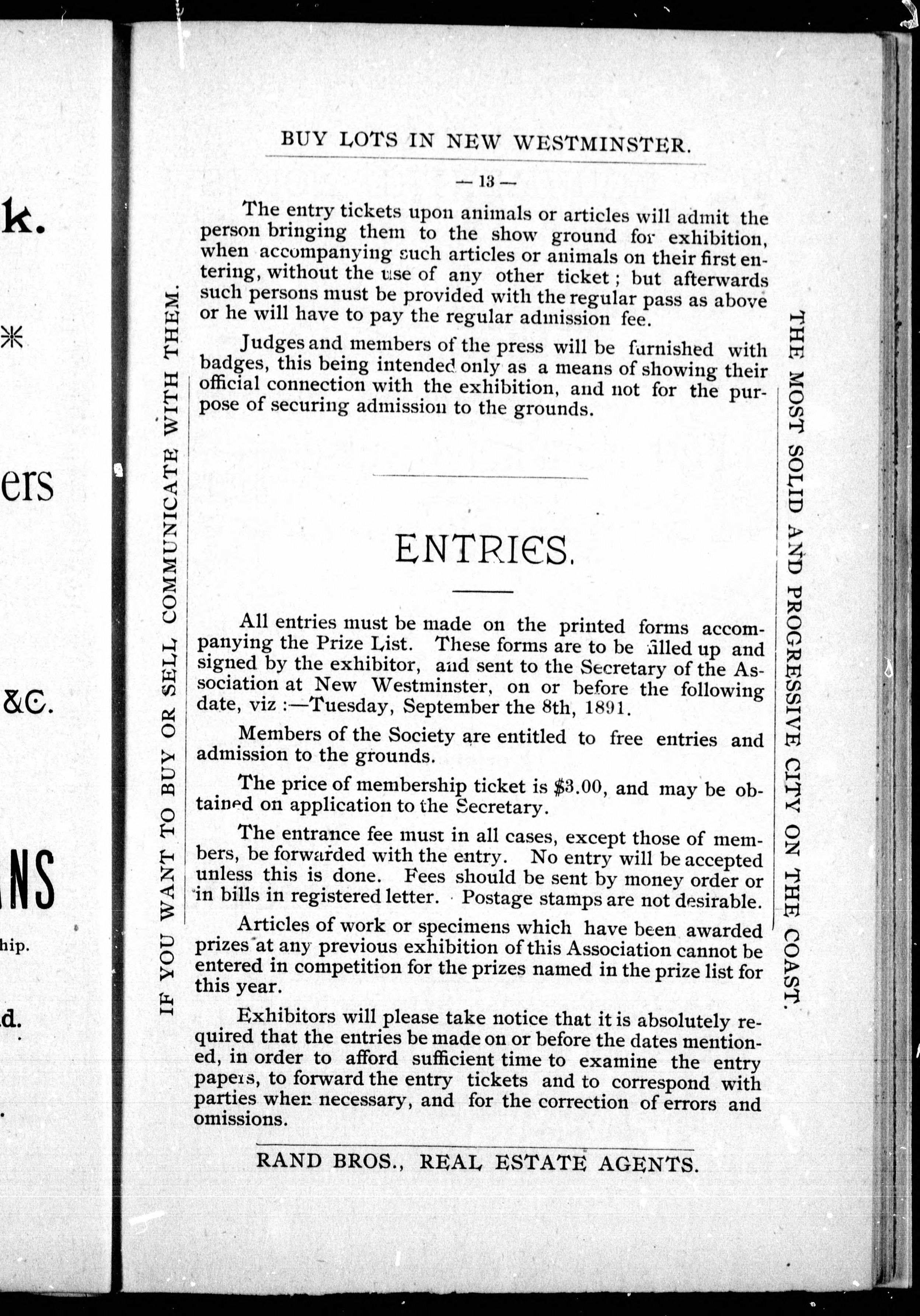 Exhibition of 1891 to be held at New Westminster, B.C. Tuesday, Wednesday, Thursday and Friday, September 22, 23, 24 and 25 : programme, rules and regulations. - Adresse bibliographique