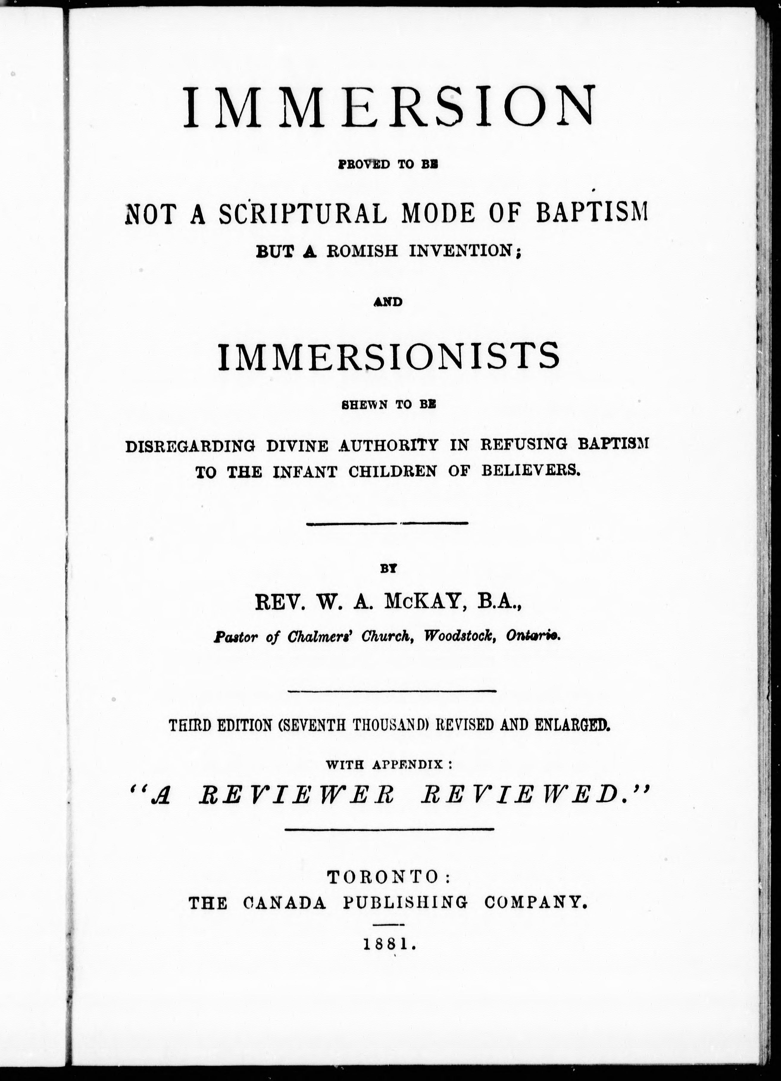 - Immersion proved to be not a scriptural mode of baptism but a Romish invention, and immersionists shewn to be disregarding divine authority in refusing baptism to the infant children of believers