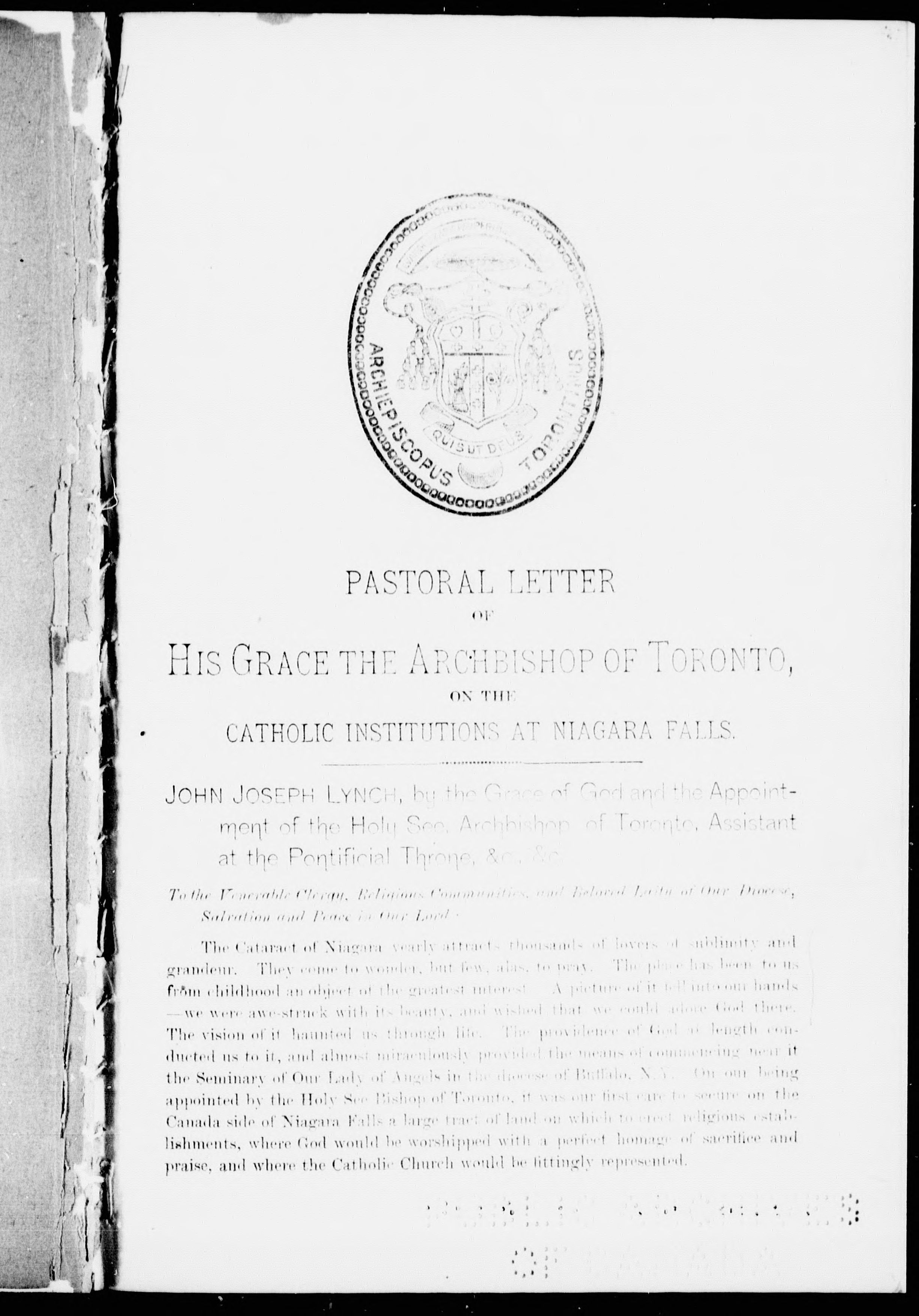 Pastoral letter of His Grace the Archbishop of Toronto [i.e. J.J. Lynch] on the Catholic institutions at Niagara Falls.