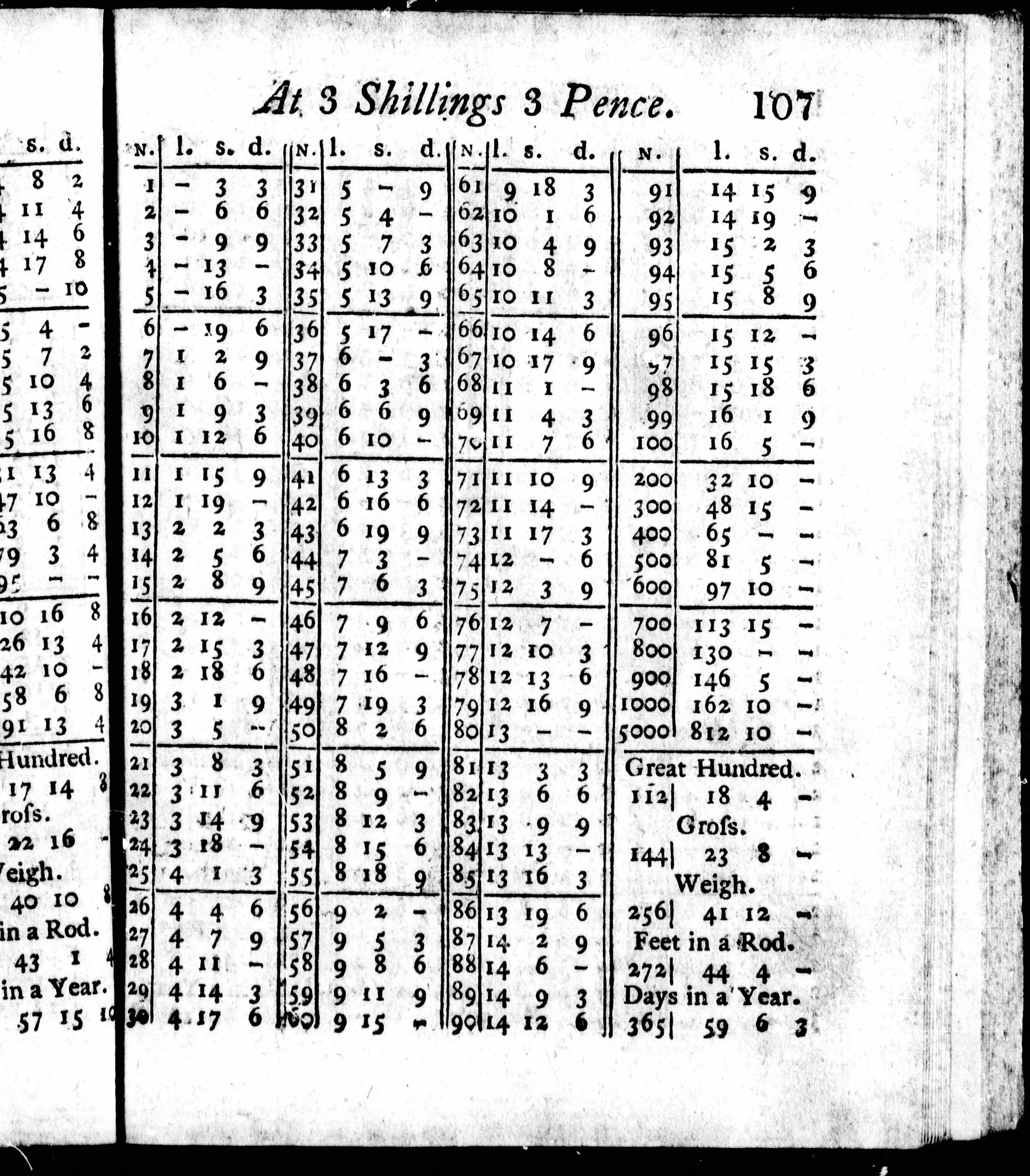 The New universal ready reckoner, or Every trader's infallible guide : containing new and complete tables, most carefully cast up, exhibiting at one point of view the value or amount of any quantity of goods, in trade or merchandise, from one farthing to twenty shillings, not only by the pound, ounce, yard, ell, &c. but also by the long or short hundred ... : to which are added a valuable catalogue of weights, measures, &c. also tables for casting-up wages by the day, week, month, and year