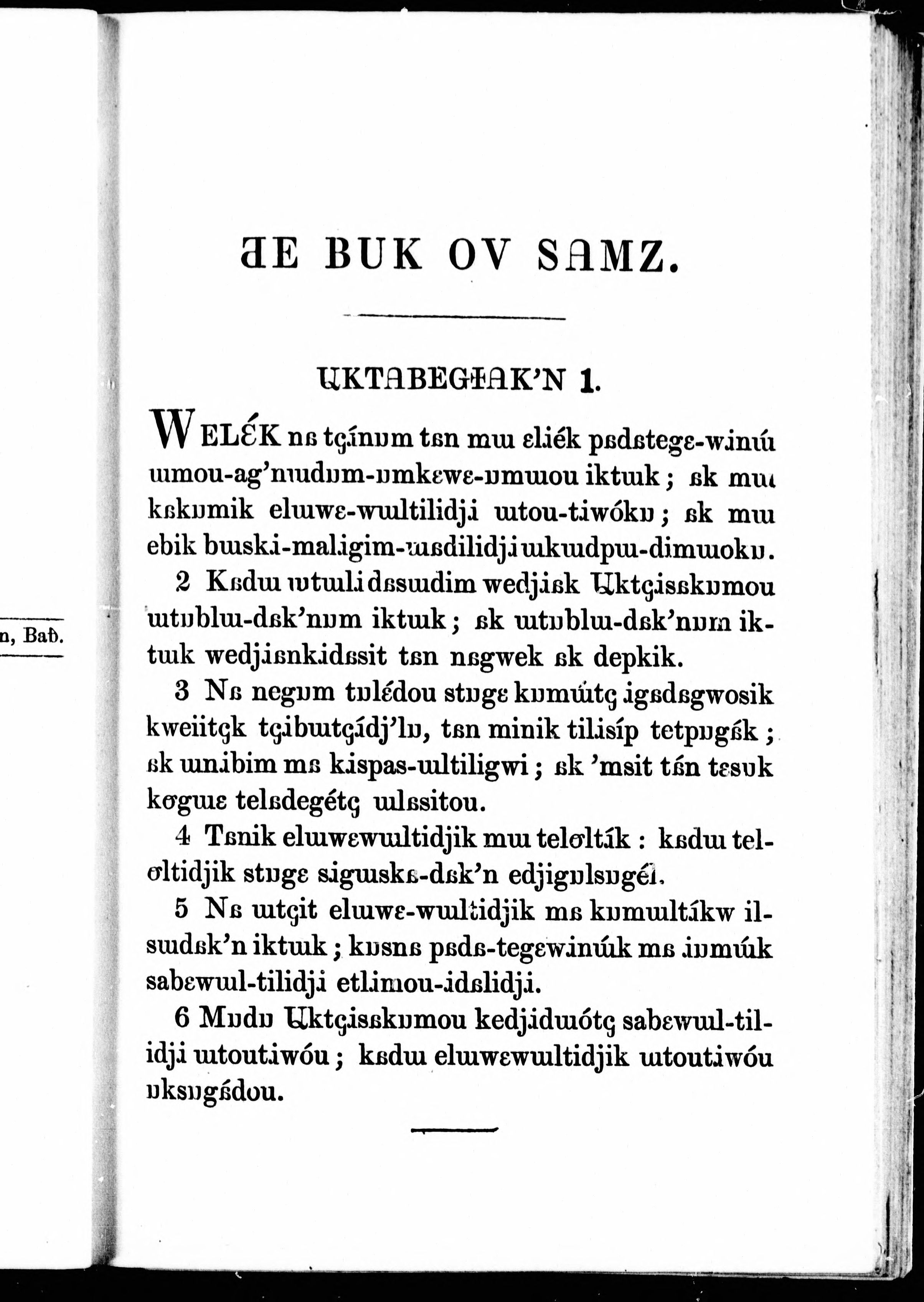 Ae [i.e. The] Buk ov Samz in Mikmak.