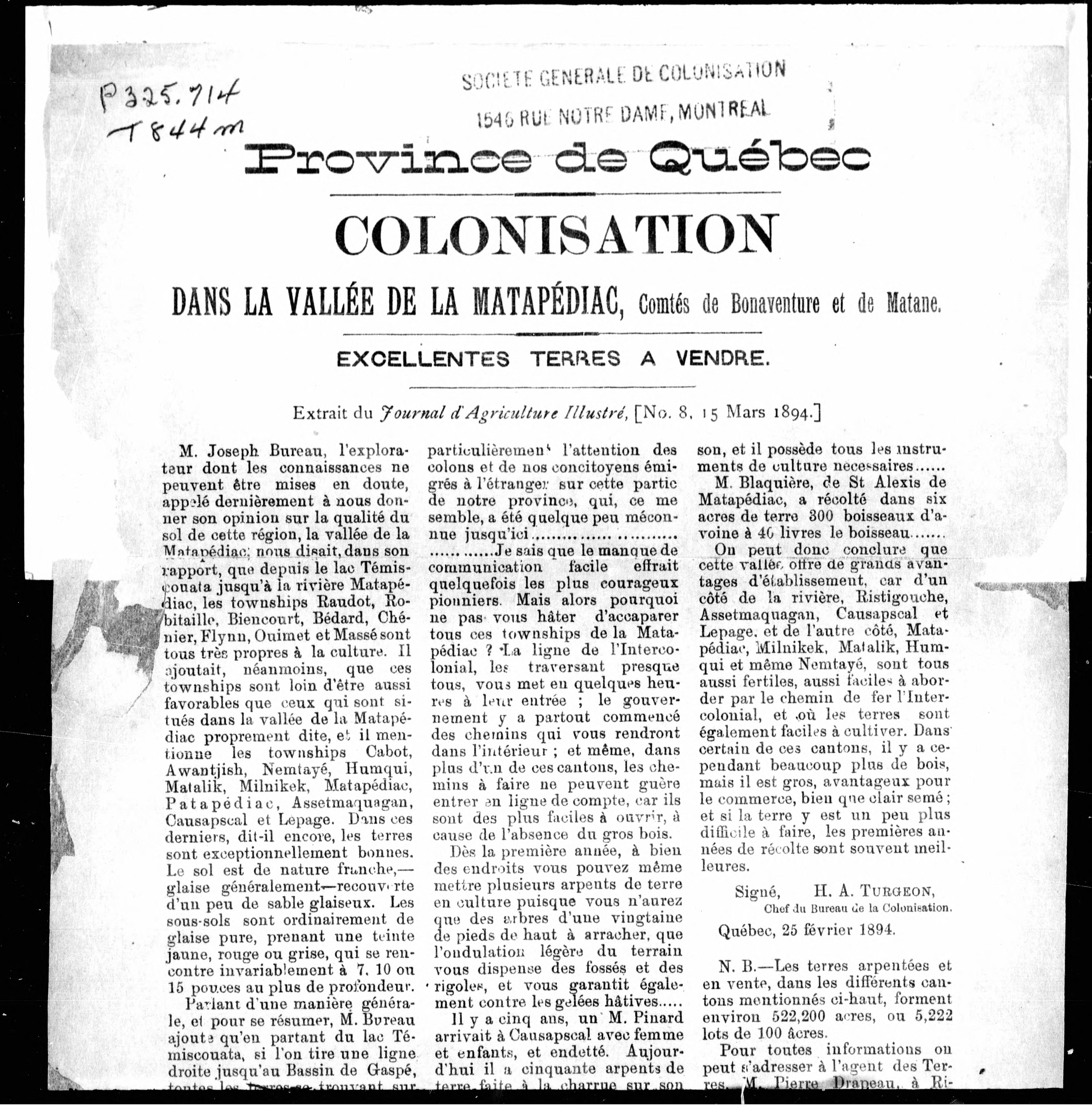 Matapédia, Vallée de la (Québec) -- Colonisation. - Document original