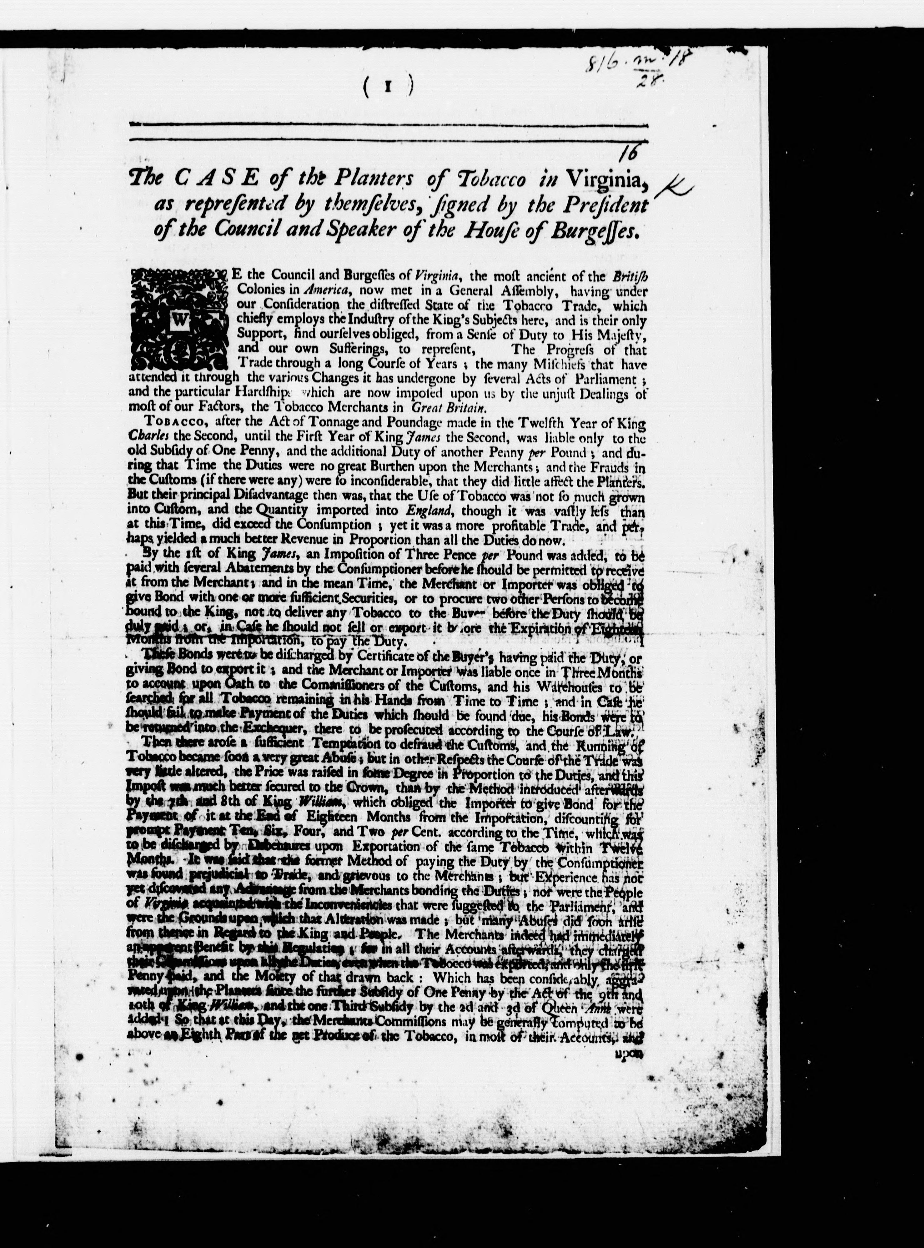 - The Case of the planters of tobacco in Virginia, as represented by themselves : signed by the president of the council and speaker of the House of Burgesses.