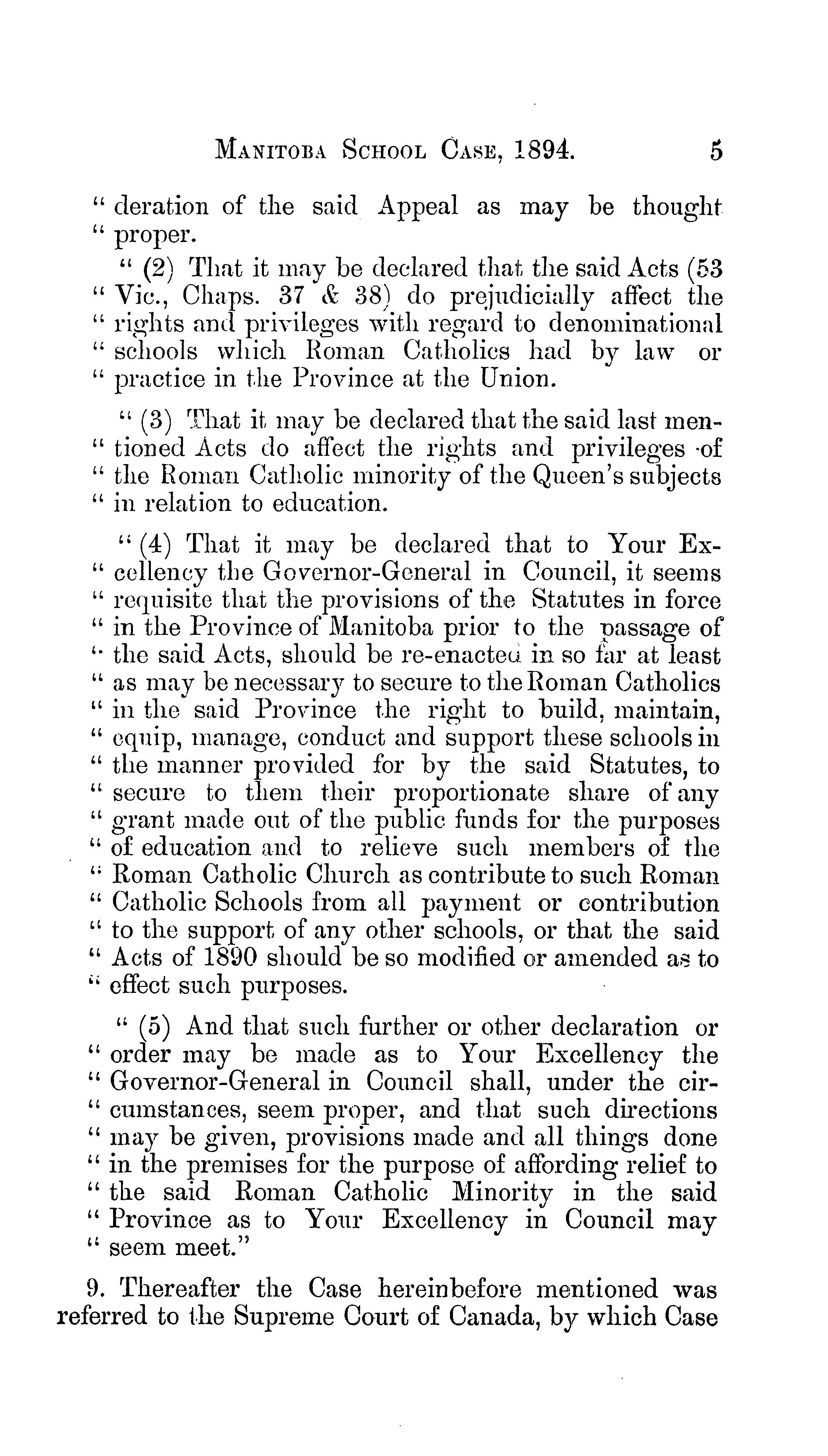 Caption title: In the Privy Council. No. 21 of 1894. On appeal from the Supreme Court of Canada. In the matter of certain statutes of the province of Manitoba relating to education. Between Gerald F. Brophy [and others] ... on behalf of themselves and of all other persons forming the Roman Catholic minority of the Queen's subjects in the province, appellants, and the attorney-general of Manitoba, respondent.