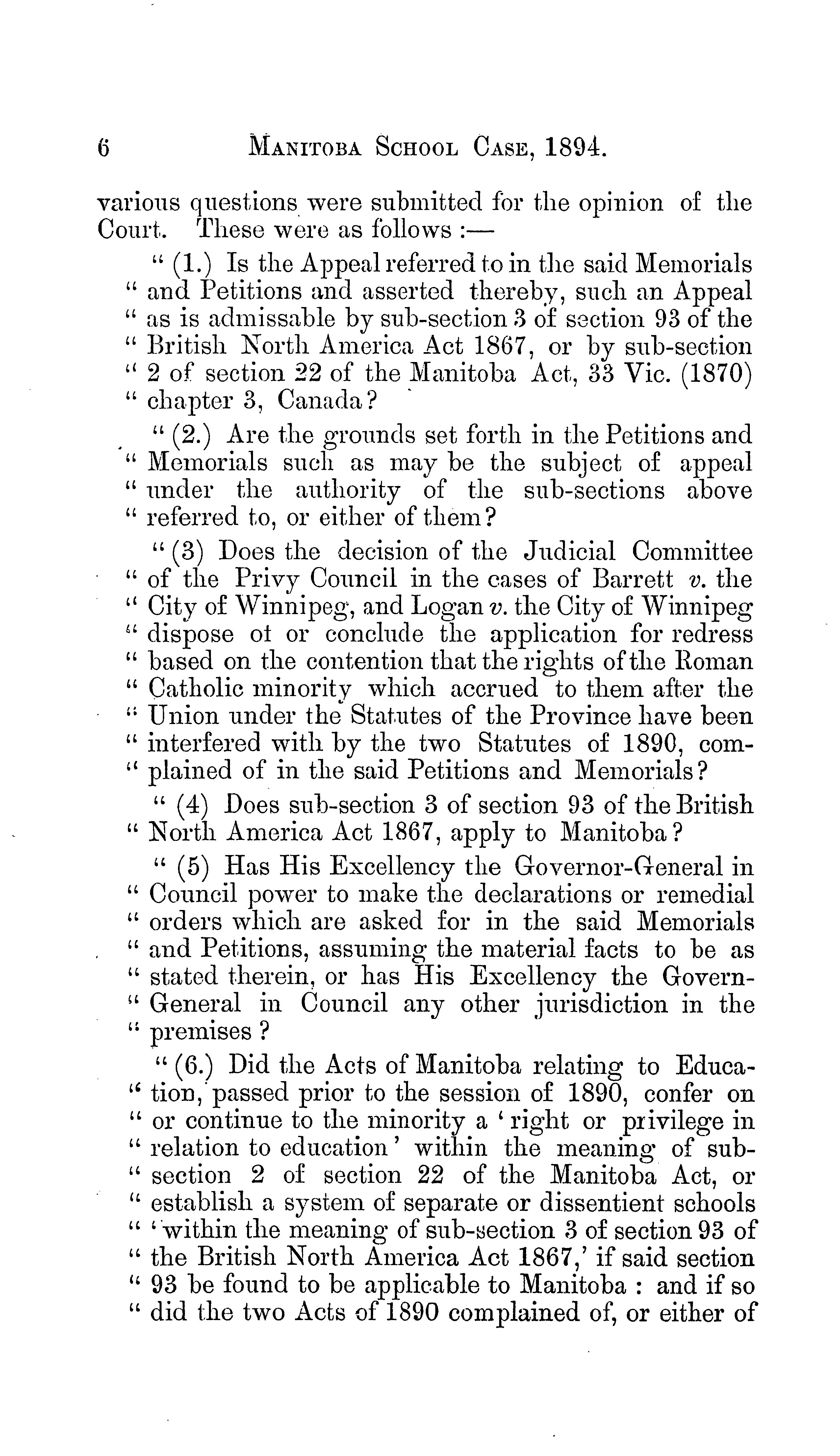 Caption title: In the Privy Council. No. 21 of 1894. On appeal from the Supreme Court of Canada. In the matter of certain statutes of the province of Manitoba relating to education. Between Gerald F. Brophy [and others] ... on behalf of themselves and of all other persons forming the Roman Catholic minority of the Queen's subjects in the province, appellants, and the attorney-general of Manitoba, respondent.