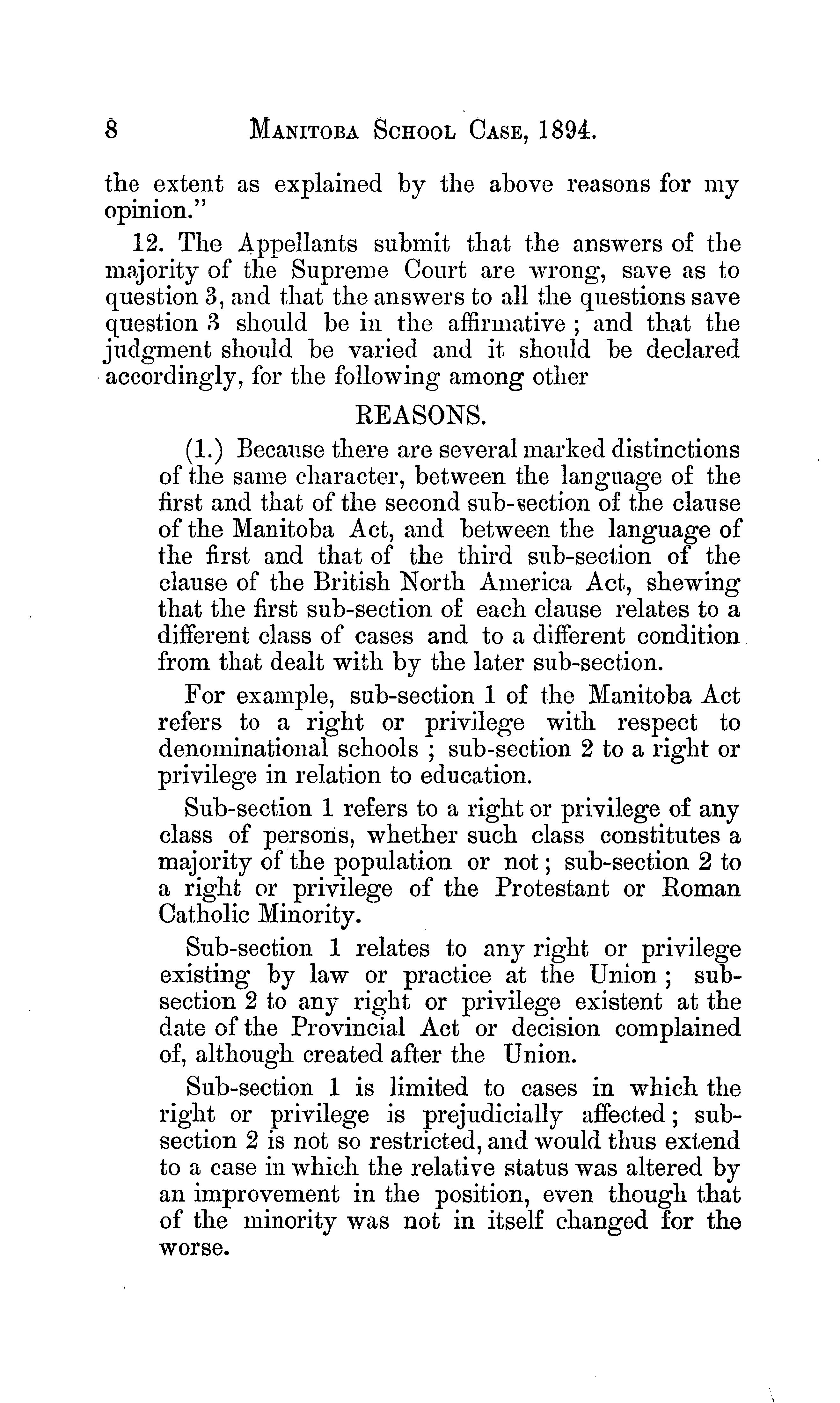 Caption title: In the Privy Council. No. 21 of 1894. On appeal from the Supreme Court of Canada. In the matter of certain statutes of the province of Manitoba relating to education. Between Gerald F. Brophy [and others] ... on behalf of themselves and of all other persons forming the Roman Catholic minority of the Queen's subjects in the province, appellants, and the attorney-general of Manitoba, respondent.