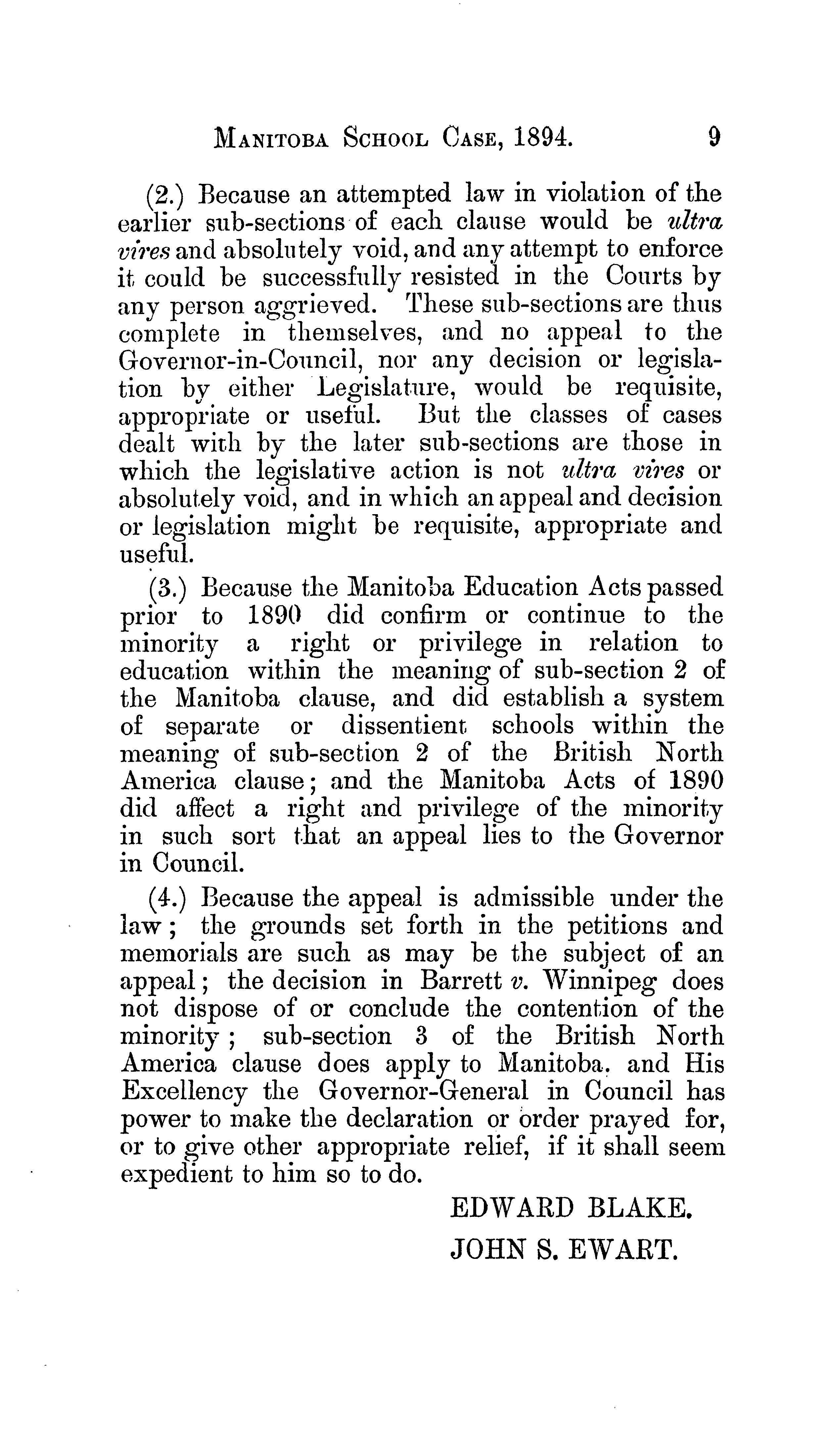 Caption title: In the Privy Council. No. 21 of 1894. On appeal from the Supreme Court of Canada. In the matter of certain statutes of the province of Manitoba relating to education. Between Gerald F. Brophy [and others] ... on behalf of themselves and of all other persons forming the Roman Catholic minority of the Queen's subjects in the province, appellants, and the attorney-general of Manitoba, respondent.