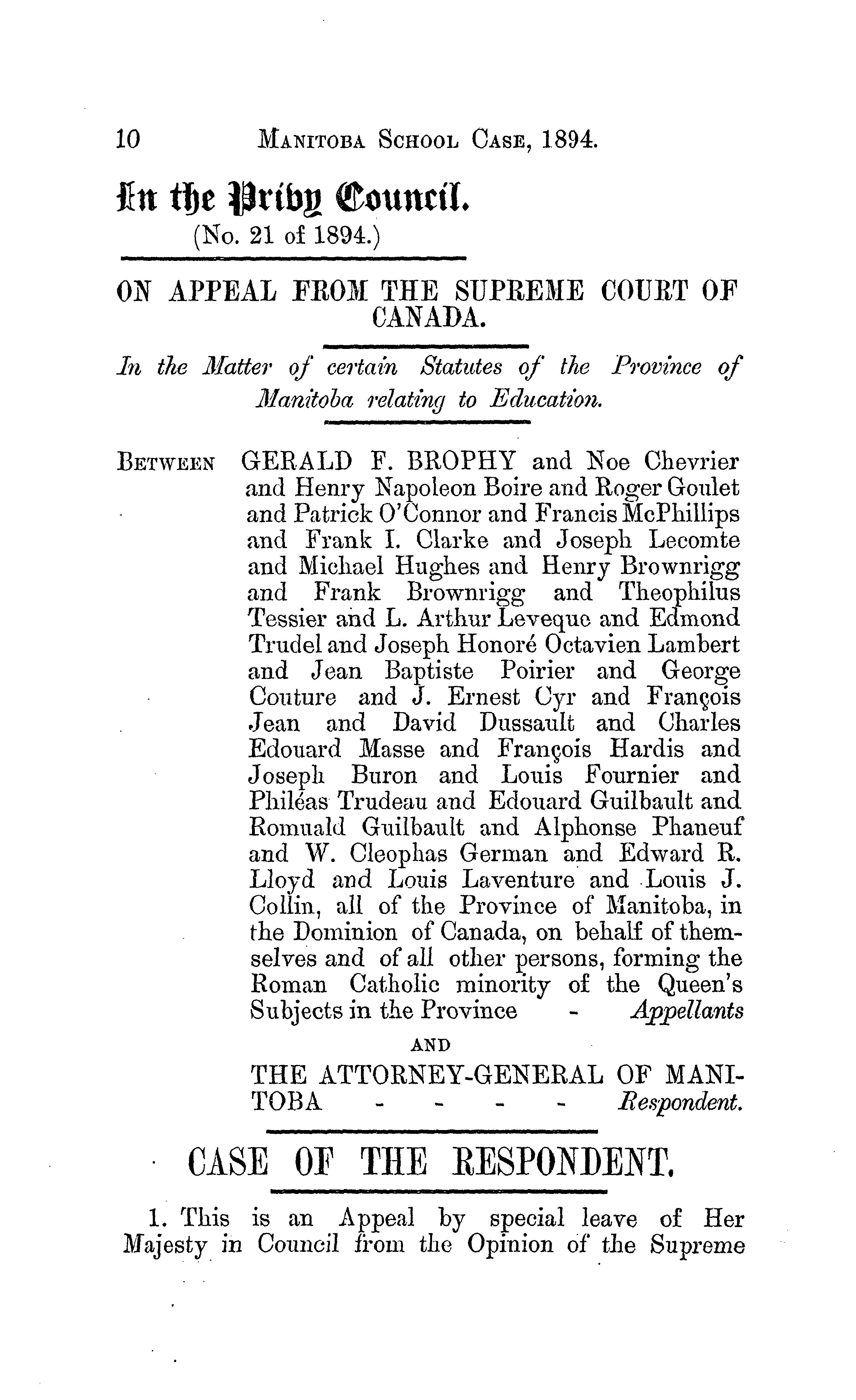 Caption title: In the Privy Council. No. 21 of 1894. On appeal from the Supreme Court of Canada. In the matter of certain statutes of the province of Manitoba relating to education. Between Gerald F. Brophy [and others] ... on behalf of themselves and of all other persons forming the Roman Catholic minority of the Queen's subjects in the province, appellants, and the attorney-general of Manitoba, respondent.