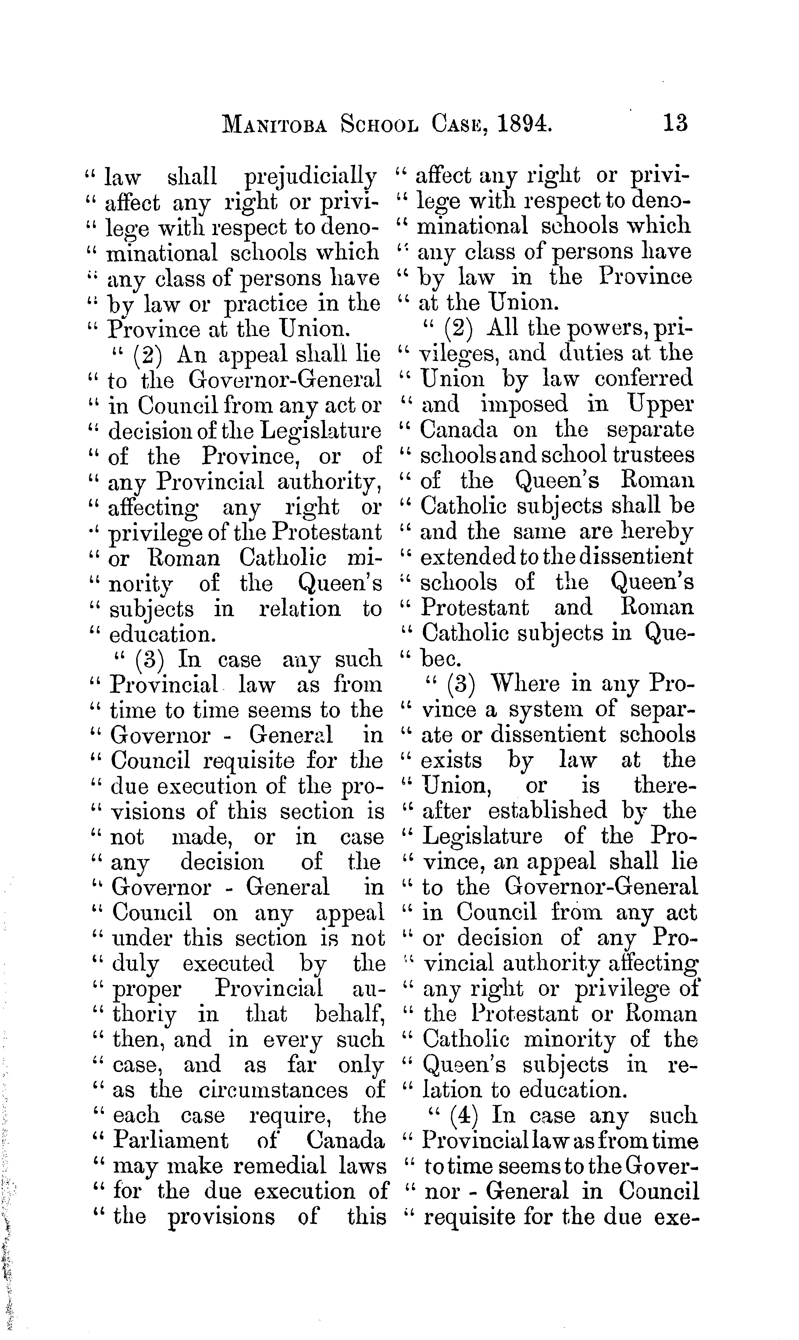 Caption title: In the Privy Council. No. 21 of 1894. On appeal from the Supreme Court of Canada. In the matter of certain statutes of the province of Manitoba relating to education. Between Gerald F. Brophy [and others] ... on behalf of themselves and of all other persons forming the Roman Catholic minority of the Queen's subjects in the province, appellants, and the attorney-general of Manitoba, respondent.