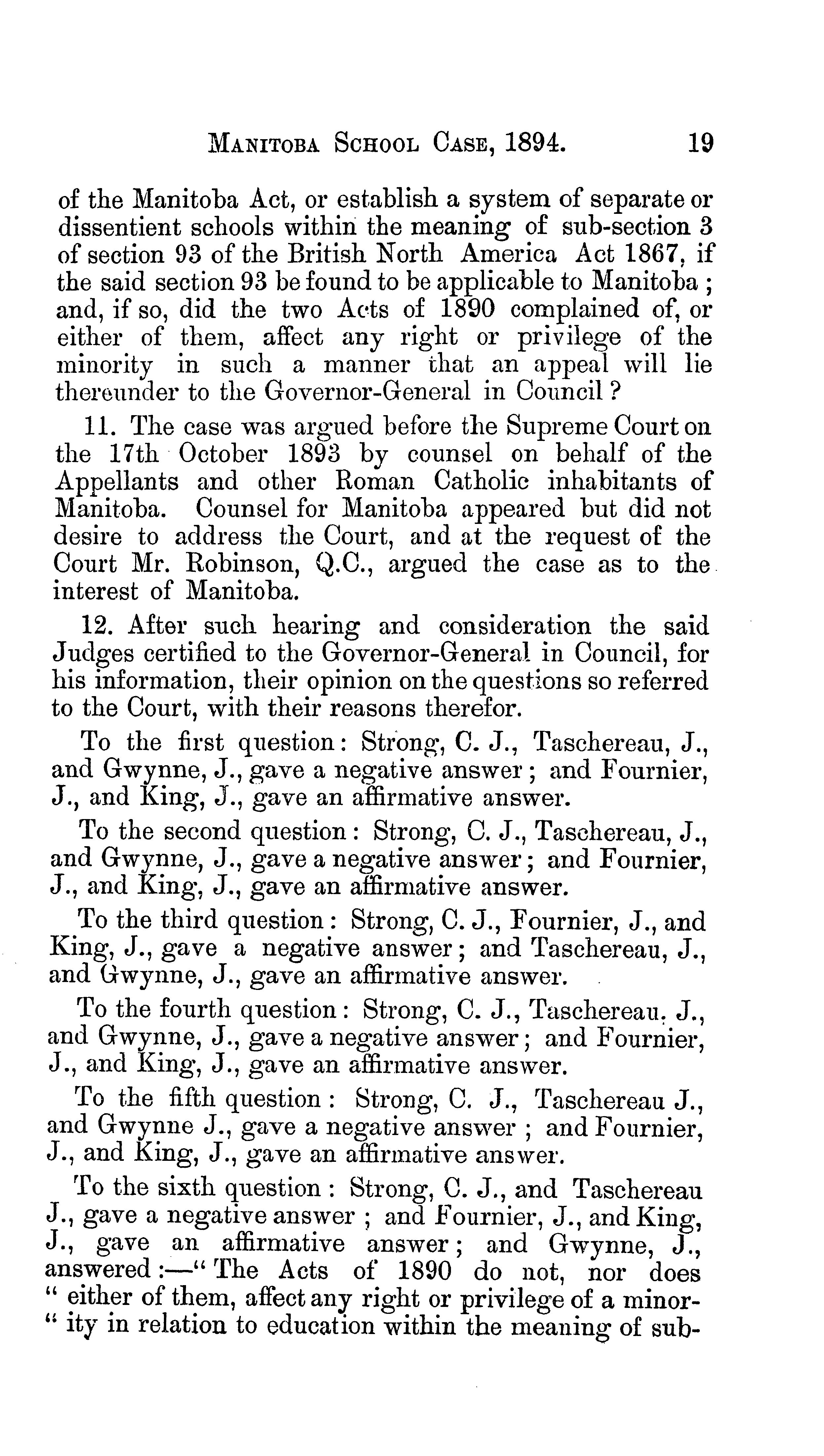 Caption title: In the Privy Council. No. 21 of 1894. On appeal from the Supreme Court of Canada. In the matter of certain statutes of the province of Manitoba relating to education. Between Gerald F. Brophy [and others] ... on behalf of themselves and of all other persons forming the Roman Catholic minority of the Queen's subjects in the province, appellants, and the attorney-general of Manitoba, respondent.