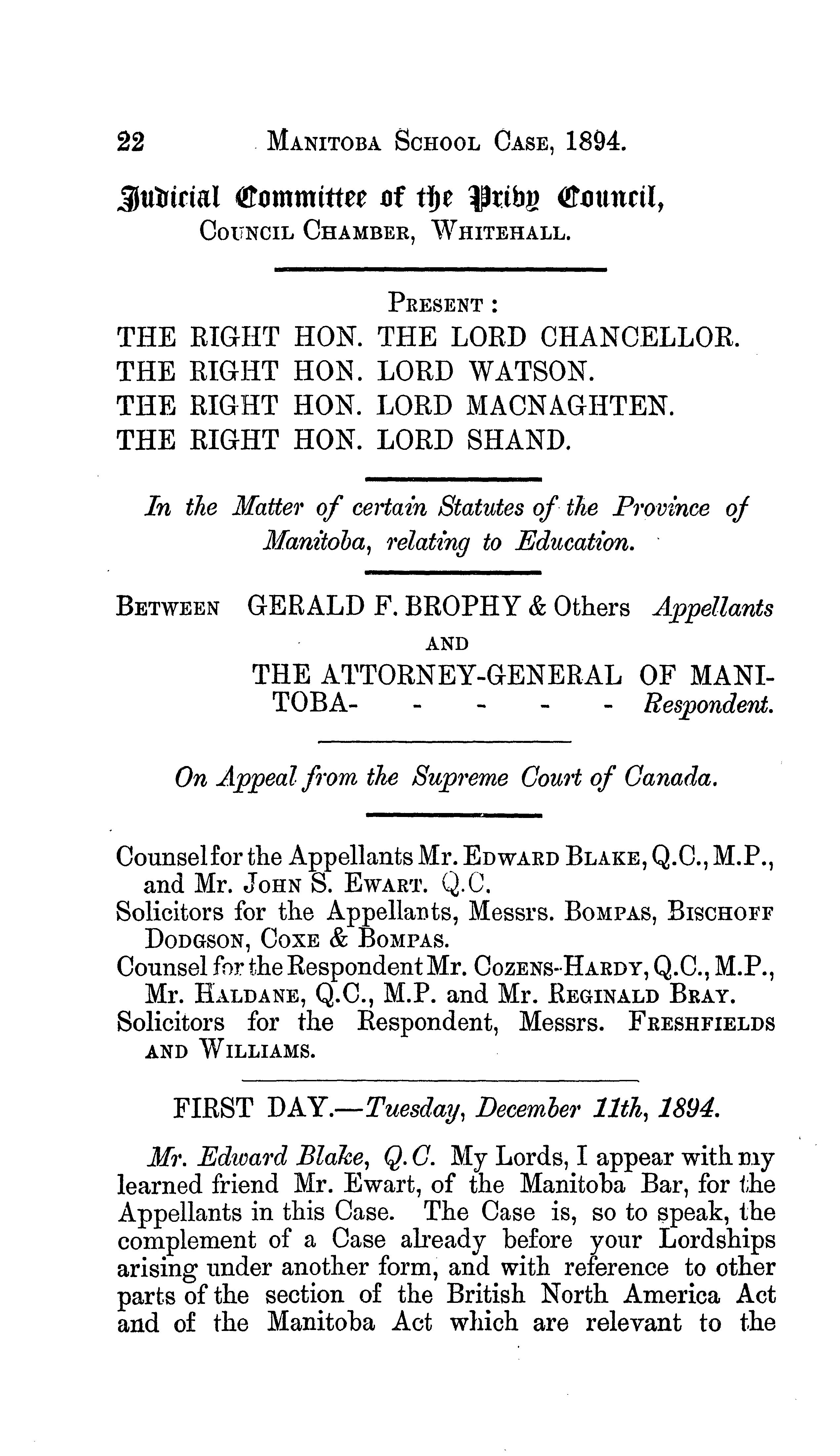 Caption title: In the Privy Council. No. 21 of 1894. On appeal from the Supreme Court of Canada. In the matter of certain statutes of the province of Manitoba relating to education. Between Gerald F. Brophy [and others] ... on behalf of themselves and of all other persons forming the Roman Catholic minority of the Queen's subjects in the province, appellants, and the attorney-general of Manitoba, respondent.