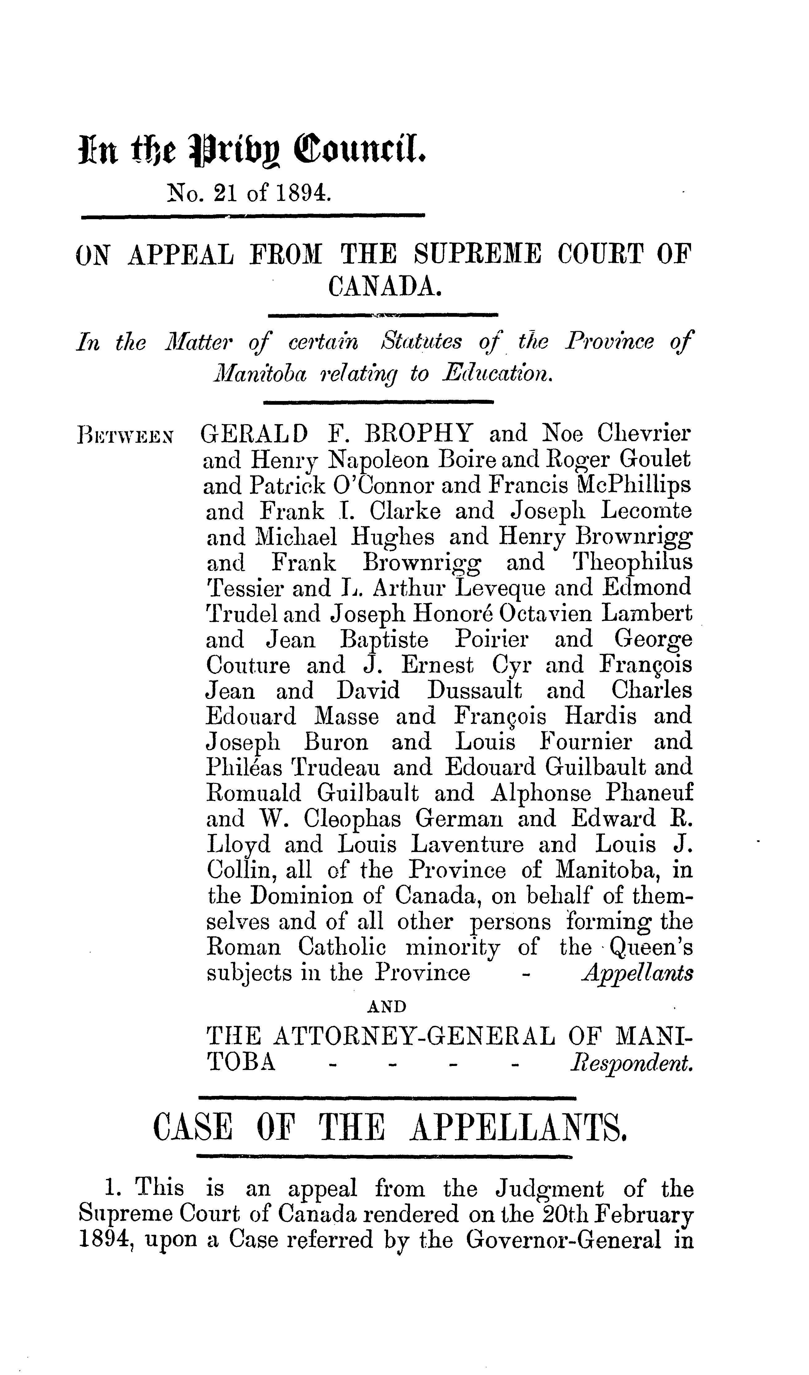 Caption title: In the Privy Council. No. 21 of 1894. On appeal from the Supreme Court of Canada. In the matter of certain statutes of the province of Manitoba relating to education. Between Gerald F. Brophy [and others] ... on behalf of themselves and of all other persons forming the Roman Catholic minority of the Queen's subjects in the province, appellants, and the attorney-general of Manitoba, respondent.