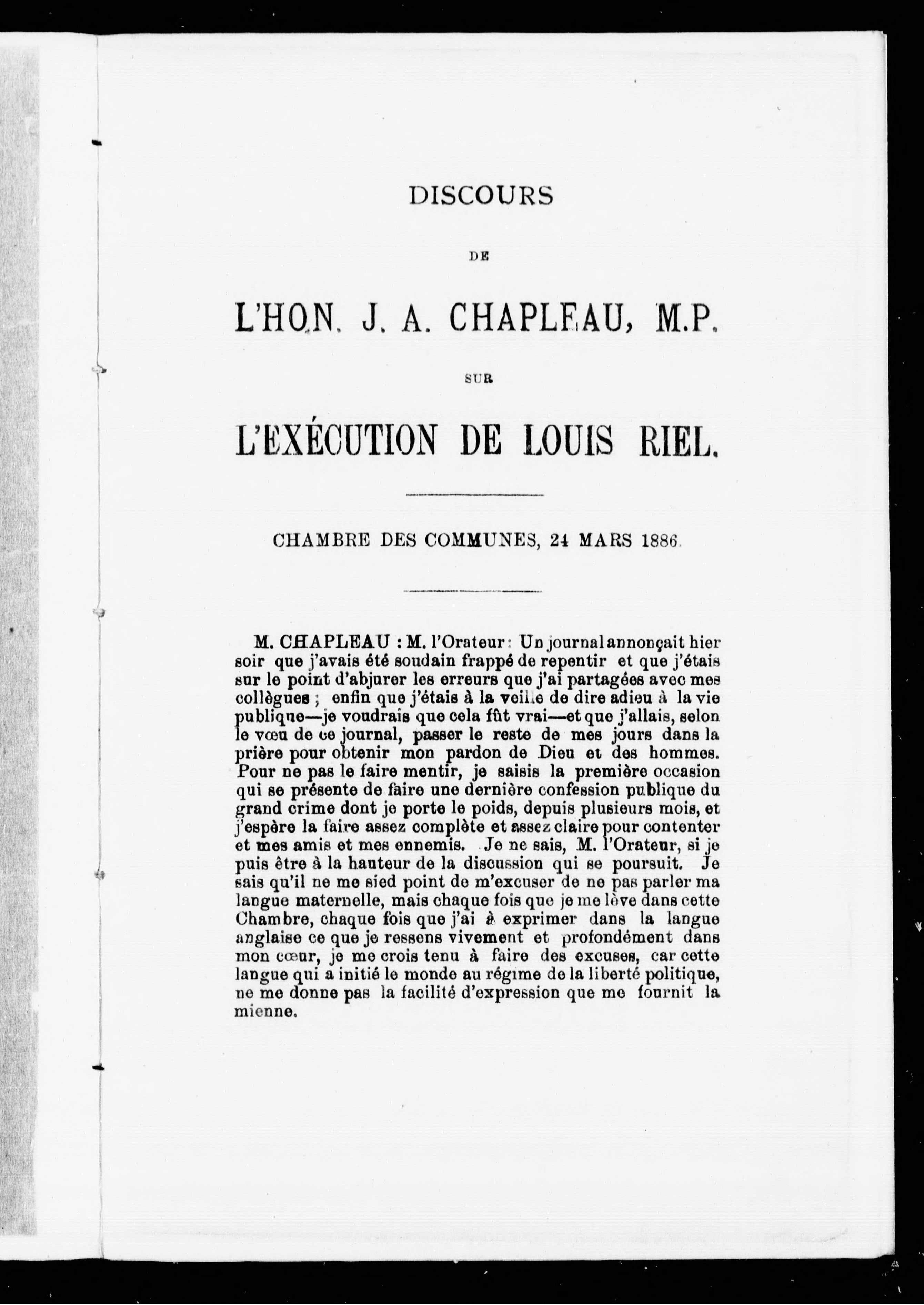 - Discours de l'hon. J.A. Chapleau, M.P., sur l'exécution de Louis Riel.