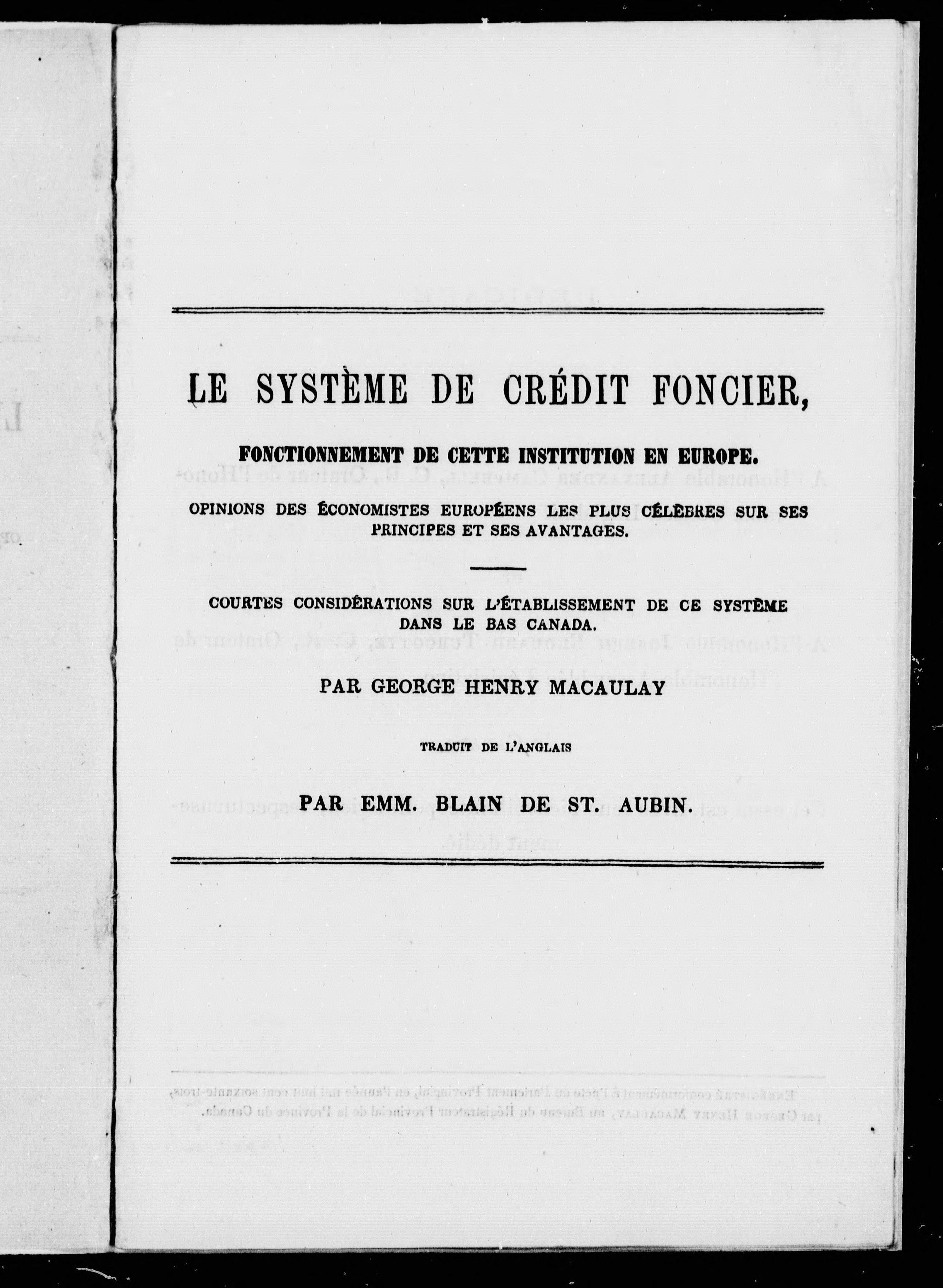- Le système de crédit foncier, fonctionnement de cette institution en Europe : opinions des économistes européens les plus célè bres sur ses principes et ses avantages : courtes considérations sur l'établissement de ce système dans le Bas Canada