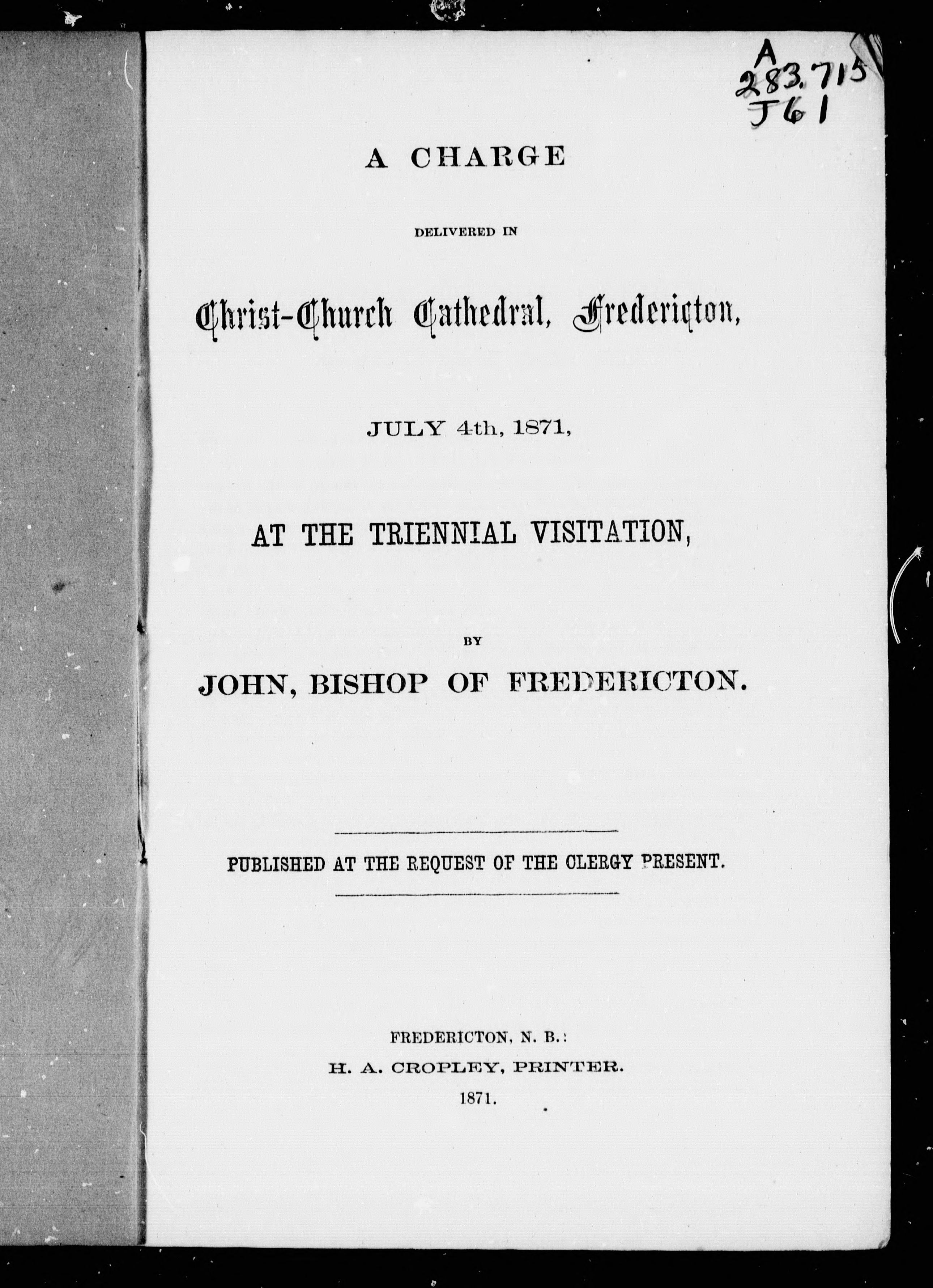A charge delivered in Christ-Church Cathedral, Fredericton : July 4th, 1871, at the triennial visitation - Adresse bibliographique