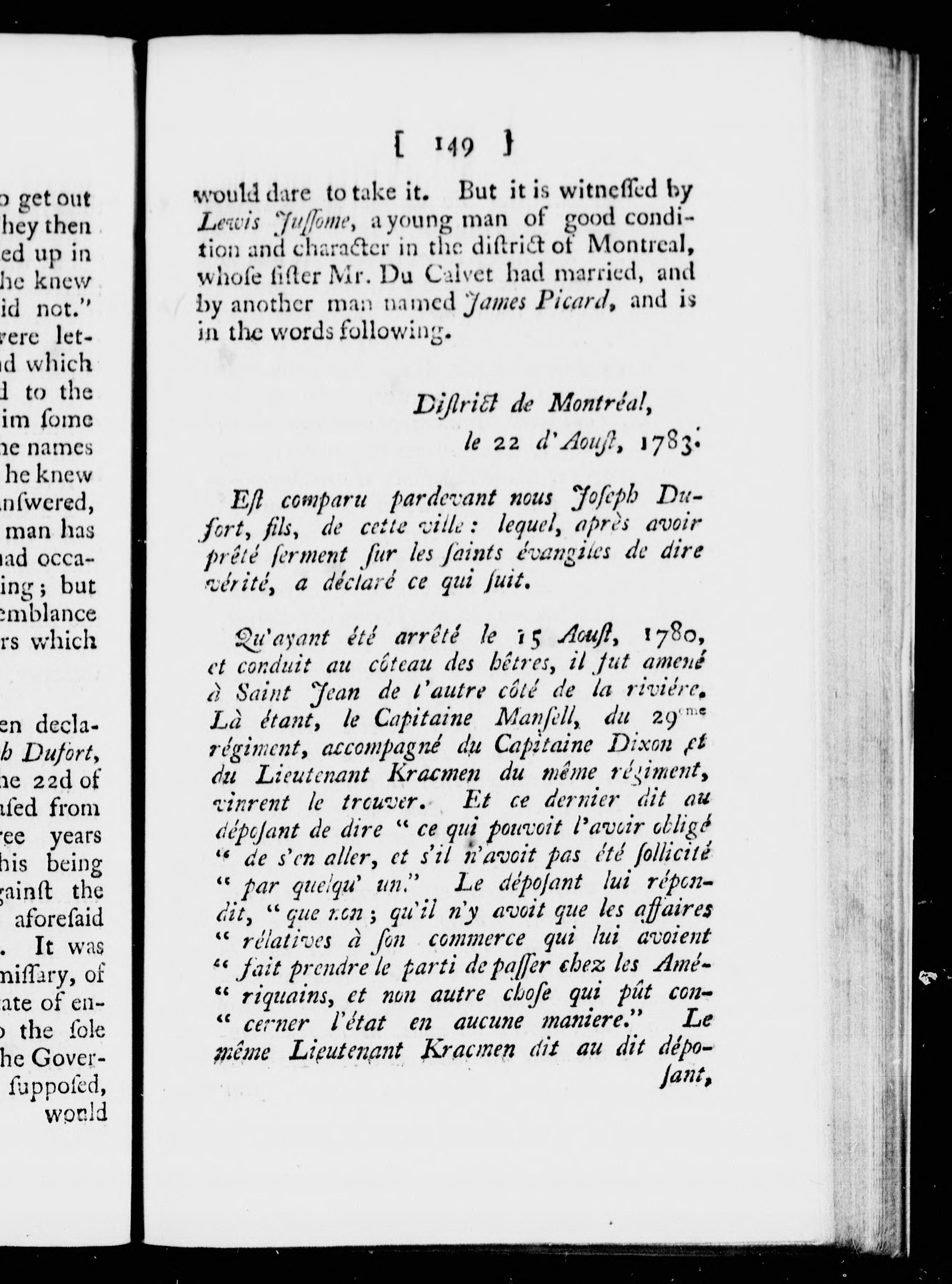 The case of Peter Du Calvet, Esq. of Montreal in the province of Quebeck : containing (amongst other things worth notice) an account of the long and severe imprisonment he suffered in the said province by the order of General Haldimand, the present Governour of the same, without the least offence, or other lawful cause, whatever : to which is prefixed, a dedication of it in the French language (Mr. Du Calvet not understanding English) to the King's Most Excellent Majesty, humbly imploring the protection and countenance of His Majesty's royal justice in his endeavours to procure some compensation for the injuries he has received.