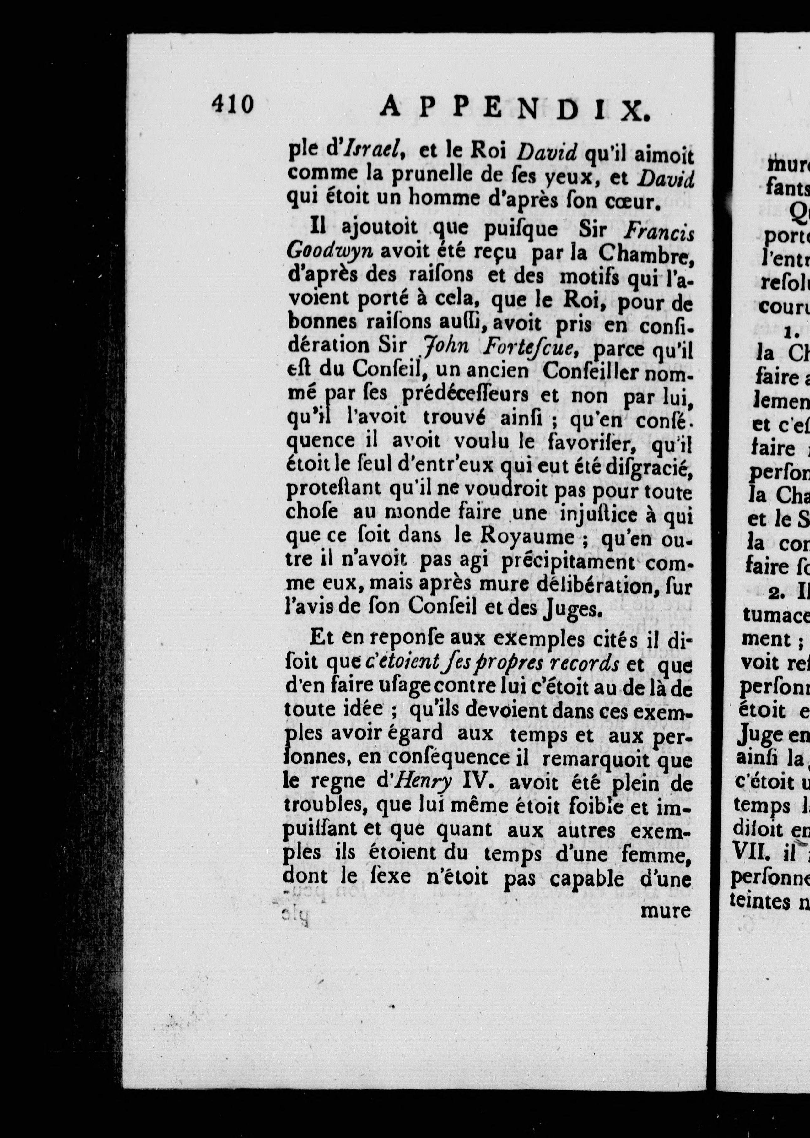 Lex parliamentaria ou Traité de la loi et coutume des parlements : montrant leur antiquité, noms, especes et qualités des trois états, et de la dignité & excellence des parlements, leur pouvoir et autorité; de l'election des membres de la Chambre des communes en géné ral, leurs privileges, qualifications et devoirs; des electeurs, leurs droits, devoirs et le mode d'élections; des retours en parlements, le devoir des shériffs et autres officiers à cet égard; de la maniere d'élire l'orateur, sa charge et son devoir; de la maniere de passer les bills, et les regles à observer dans la Chambre des communes; des sessions du parlement de sa prorogation et des ajournements, ensemble des propres loix et coutumes des parlements : avec le rapport d'un cas en Parlement entre Sir Francis Goodwyn et Sir John Fortescue, chevaliers du Comté de Bucks, 1. Jac. I.