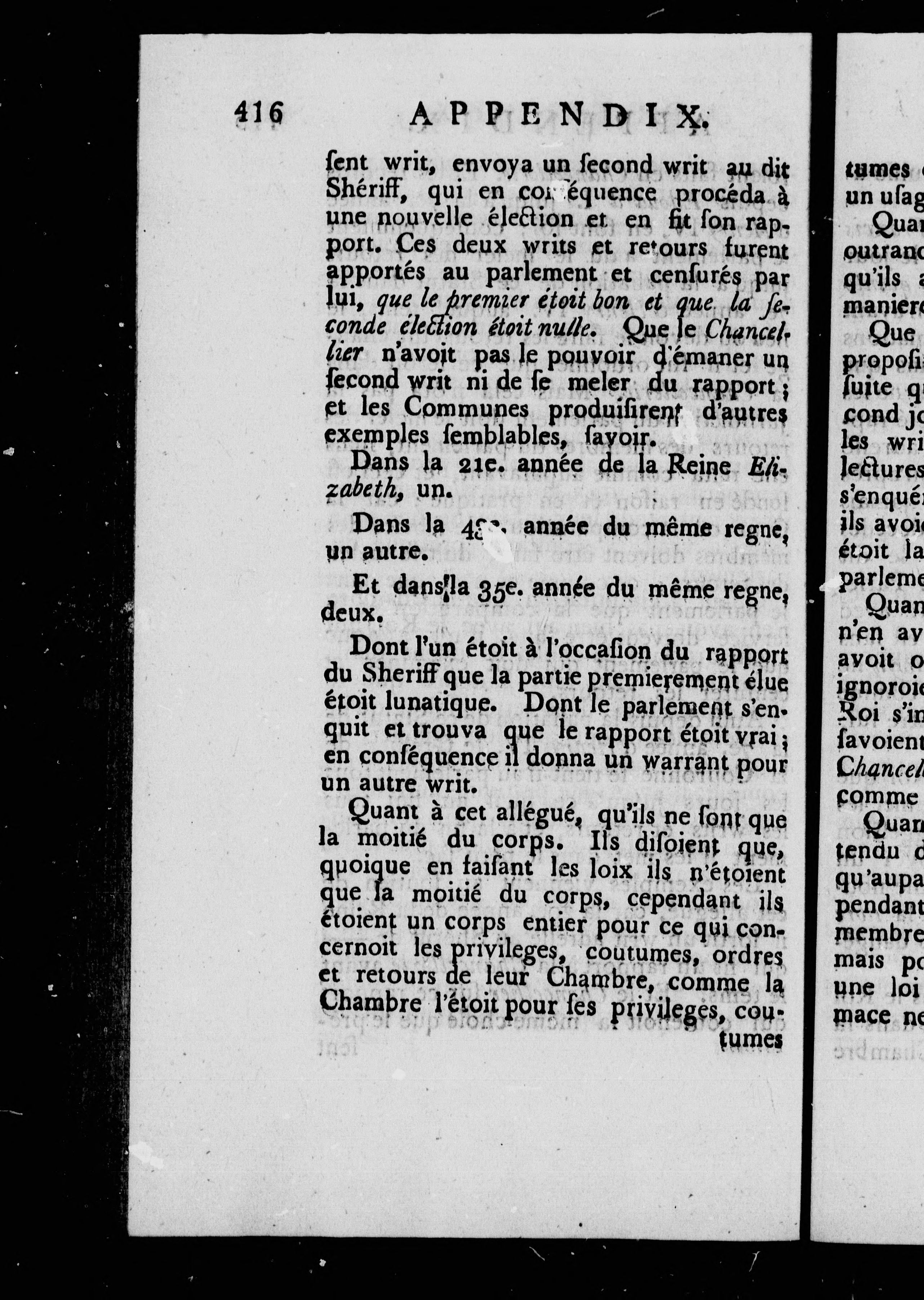 Lex parliamentaria ou Traité de la loi et coutume des parlements : montrant leur antiquité, noms, especes et qualités des trois états, et de la dignité & excellence des parlements, leur pouvoir et autorité; de l'election des membres de la Chambre des communes en géné ral, leurs privileges, qualifications et devoirs; des electeurs, leurs droits, devoirs et le mode d'élections; des retours en parlements, le devoir des shériffs et autres officiers à cet égard; de la maniere d'élire l'orateur, sa charge et son devoir; de la maniere de passer les bills, et les regles à observer dans la Chambre des communes; des sessions du parlement de sa prorogation et des ajournements, ensemble des propres loix et coutumes des parlements : avec le rapport d'un cas en Parlement entre Sir Francis Goodwyn et Sir John Fortescue, chevaliers du Comté de Bucks, 1. Jac. I.