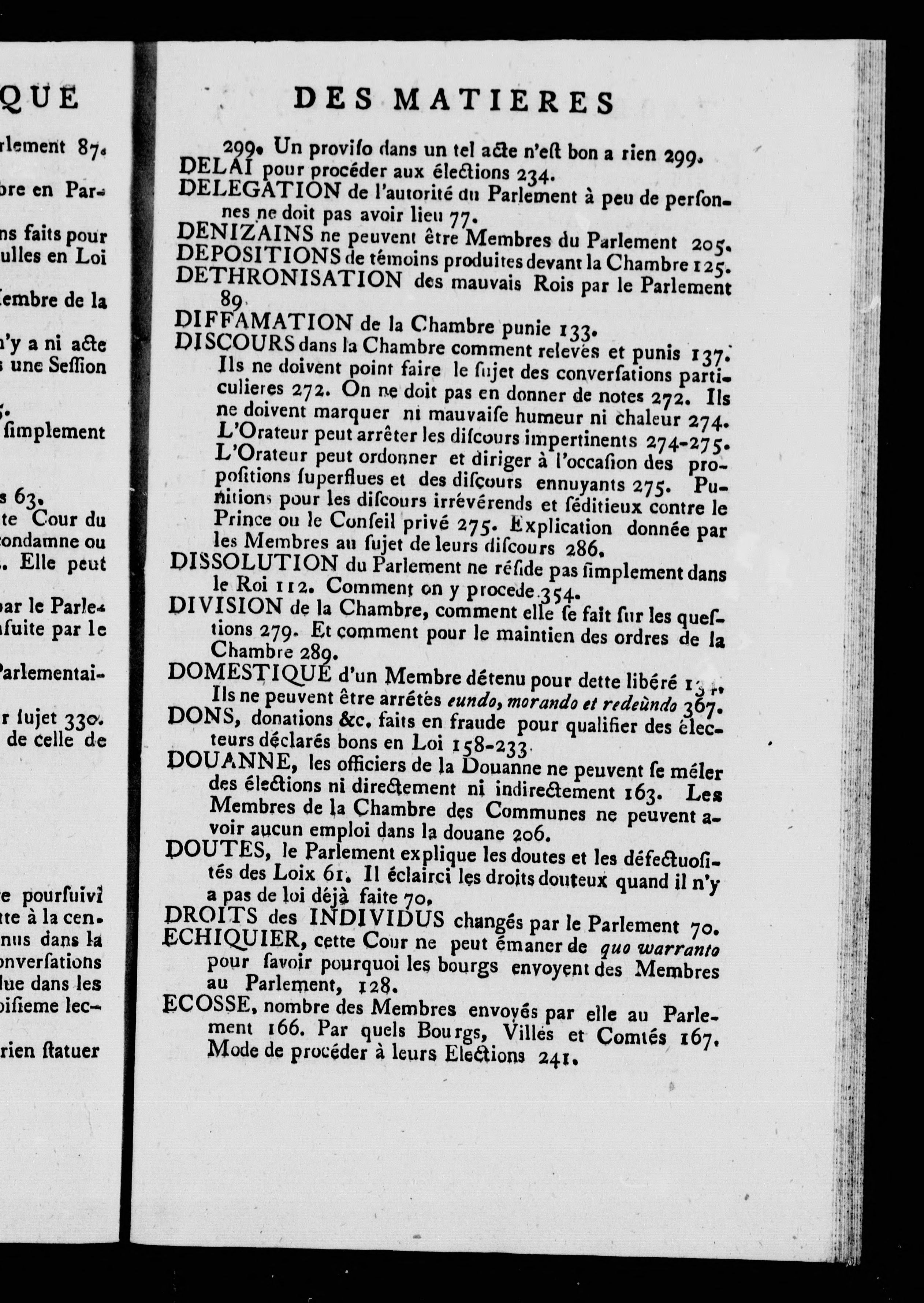 Lex parliamentaria ou Traité de la loi et coutume des parlements : montrant leur antiquité, noms, especes et qualités des trois états, et de la dignité & excellence des parlements, leur pouvoir et autorité; de l'election des membres de la Chambre des communes en géné ral, leurs privileges, qualifications et devoirs; des electeurs, leurs droits, devoirs et le mode d'élections; des retours en parlements, le devoir des shériffs et autres officiers à cet égard; de la maniere d'élire l'orateur, sa charge et son devoir; de la maniere de passer les bills, et les regles à observer dans la Chambre des communes; des sessions du parlement de sa prorogation et des ajournements, ensemble des propres loix et coutumes des parlements : avec le rapport d'un cas en Parlement entre Sir Francis Goodwyn et Sir John Fortescue, chevaliers du Comté de Bucks, 1. Jac. I.